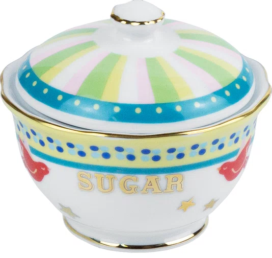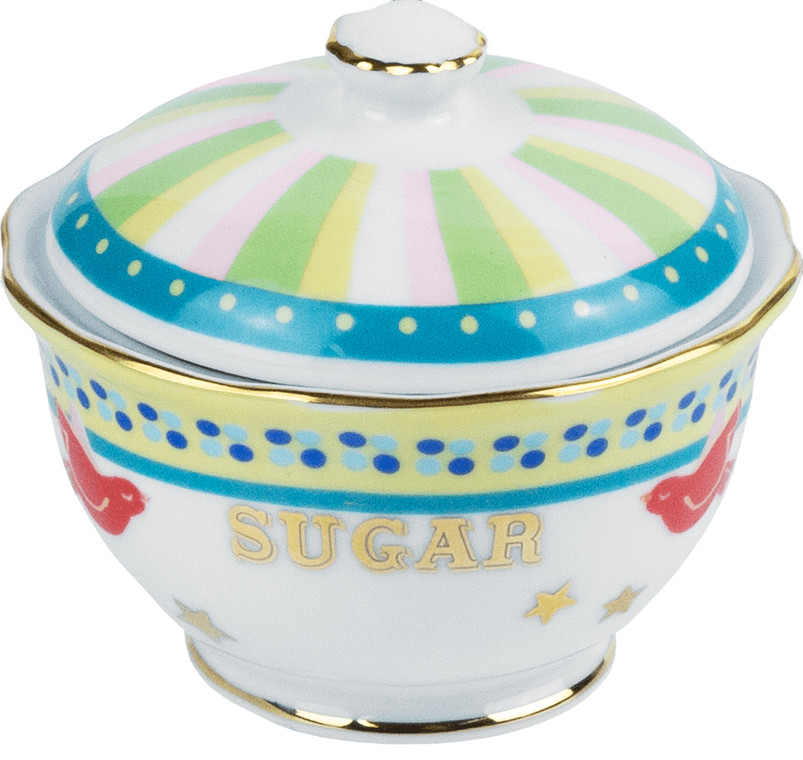 Açucareiro em porcelana com design lúdico e colorido, trazendo listras em tons de verde, amarelo, rosa e azul, além de detalhes decorativos em vermelho. A peça é valorizada pelo acabamento em friso dourado, que acrescenta requinte ao visual descontraído. Funcional e charmosa, é ideal para armazenar açúcar e compor mesas postas criativas e sofisticadas.