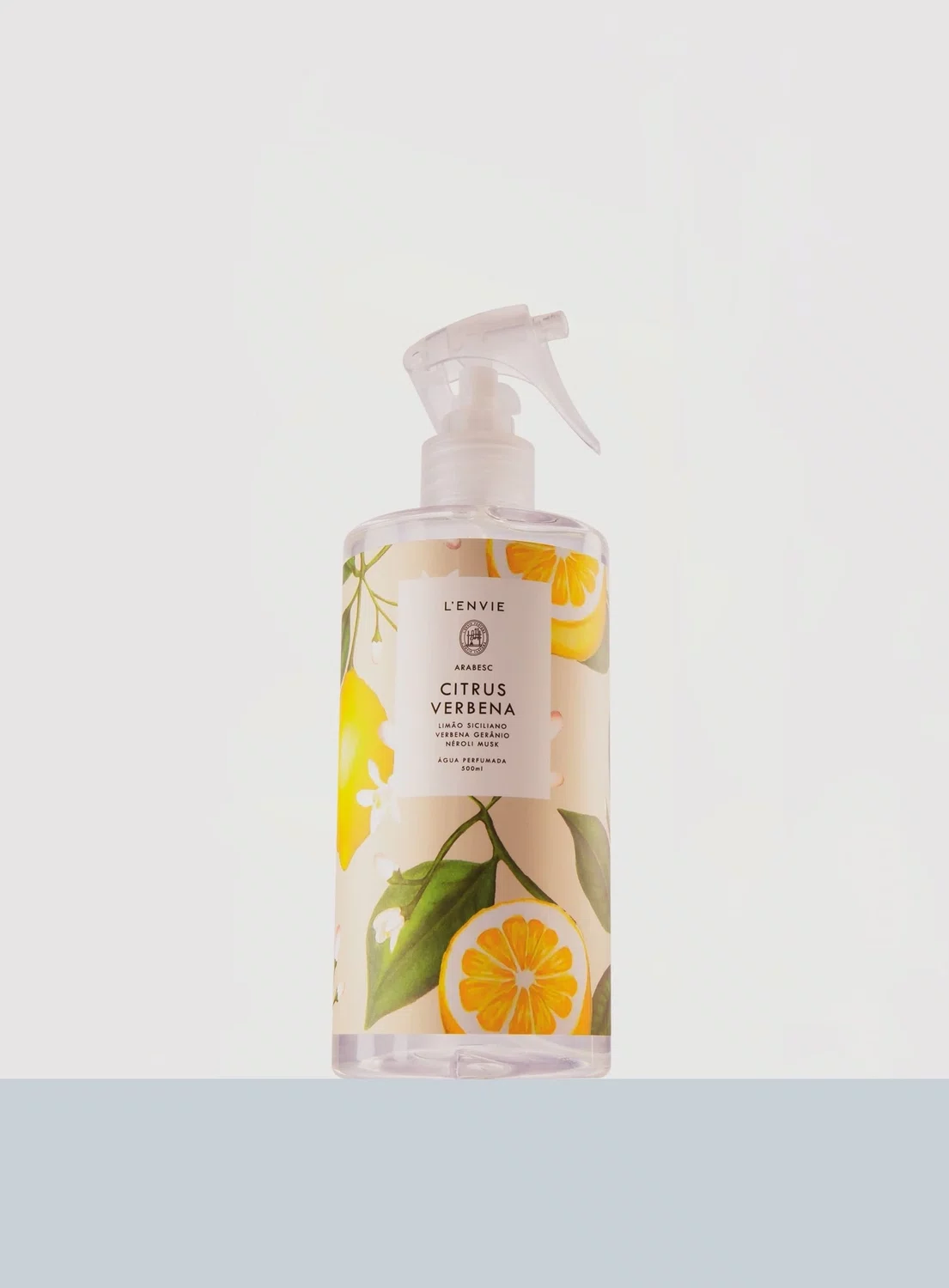 A Água Perfumada Citrus Verbena 500ml é indicada para perfumar tecidos, lençóis e roupas, estejam elas secas ou pré-lavadas. Pode também ser utilizada na perfumação do ambiente. Com uma nova identidade visual a linha Arabesc traduz suas fragrâncias por meio de autênticas aquarelas desenhadas nas embalagens. As ilustrações foram feitas por Bella Mary O’Mahony, ilustradora apaixonada pela natureza e residente na Nova Zelândia.
