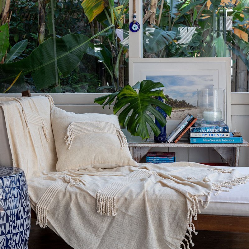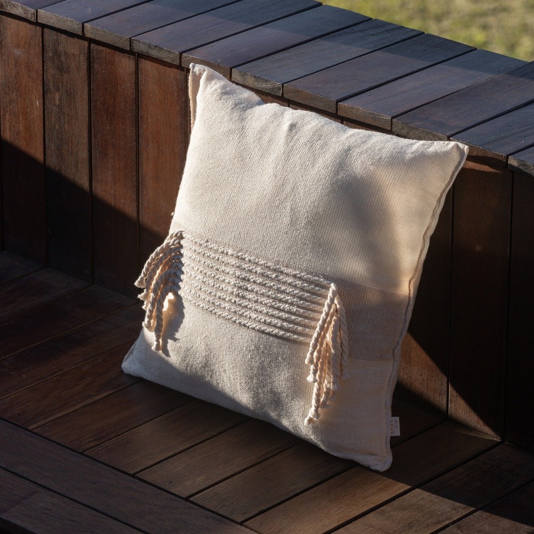Com a trama principal lisa, que pode ou não trazer uma faixa em cor diferente, essas mantas e almofadas apresentam desenhos feitos com corda torcida, incorporando movimento e textura às peças. Tudo feito de maneira artesanal, com muito amor e responsabilidade!