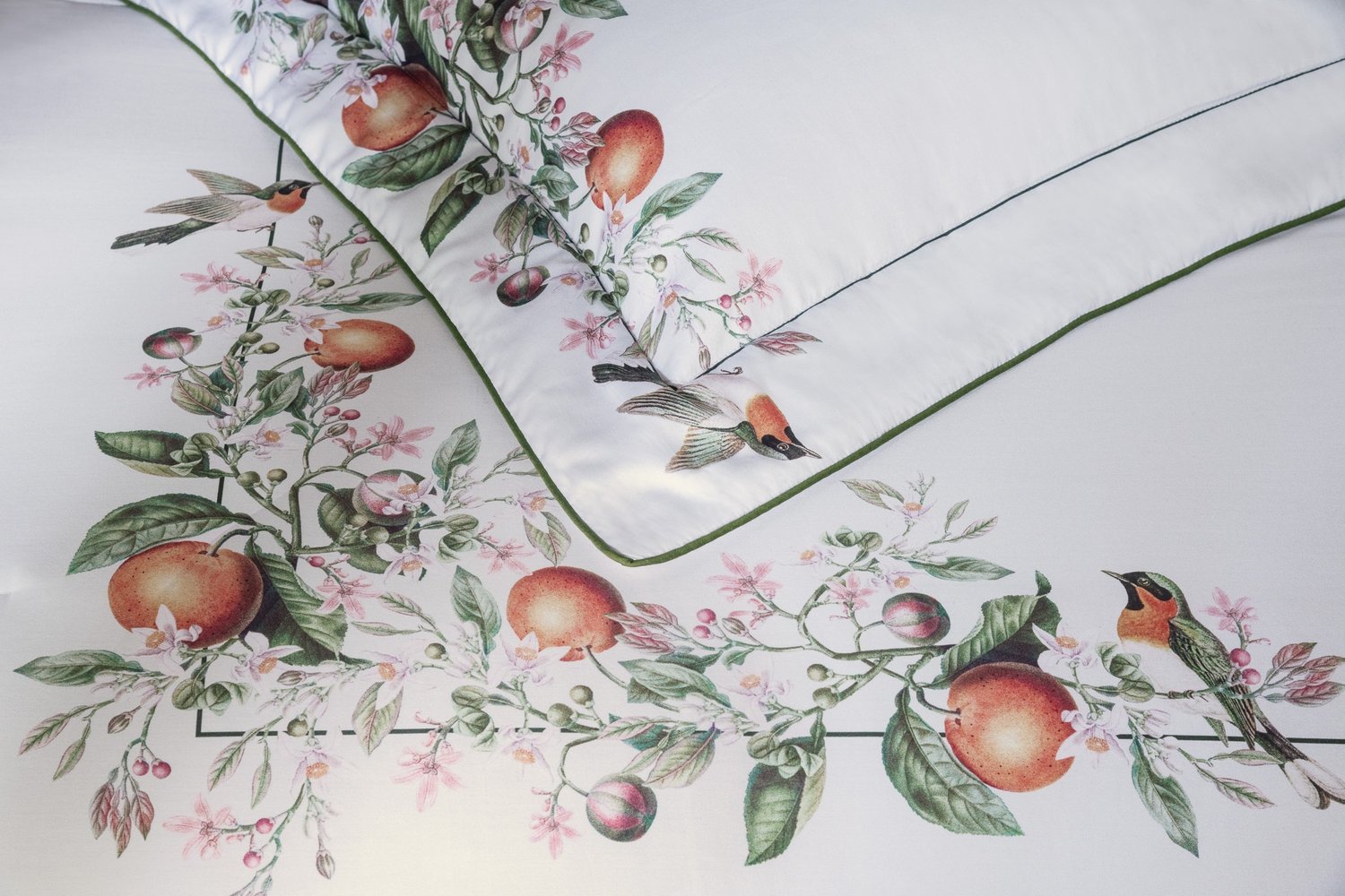 As laranjas sicilianas, com sua doçura irresistível e aroma marcante, trazem à mente a essência vibrante do Mediterrâneo. A variedade Sanguinella, com sua polpa avermelhada, é um verdadeiro tesouro da natureza. Inspirados por essa fruta encantadora, desenvolvemos o jogo de cama Arancia, cuja estamparia digital captura a alegria dos pássaros dançando entre as laranjeiras. Cada peça transforma o ambiente em um espaço acolhedor e repleto de vida, trazendo a harmonia e a luminosidade sicilianas para dentro do seu lar.