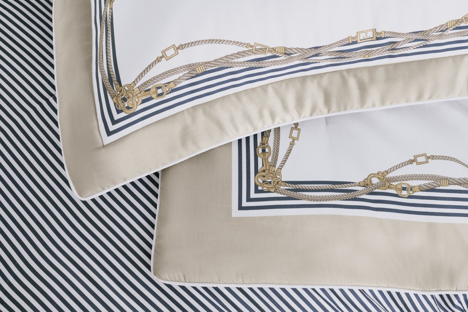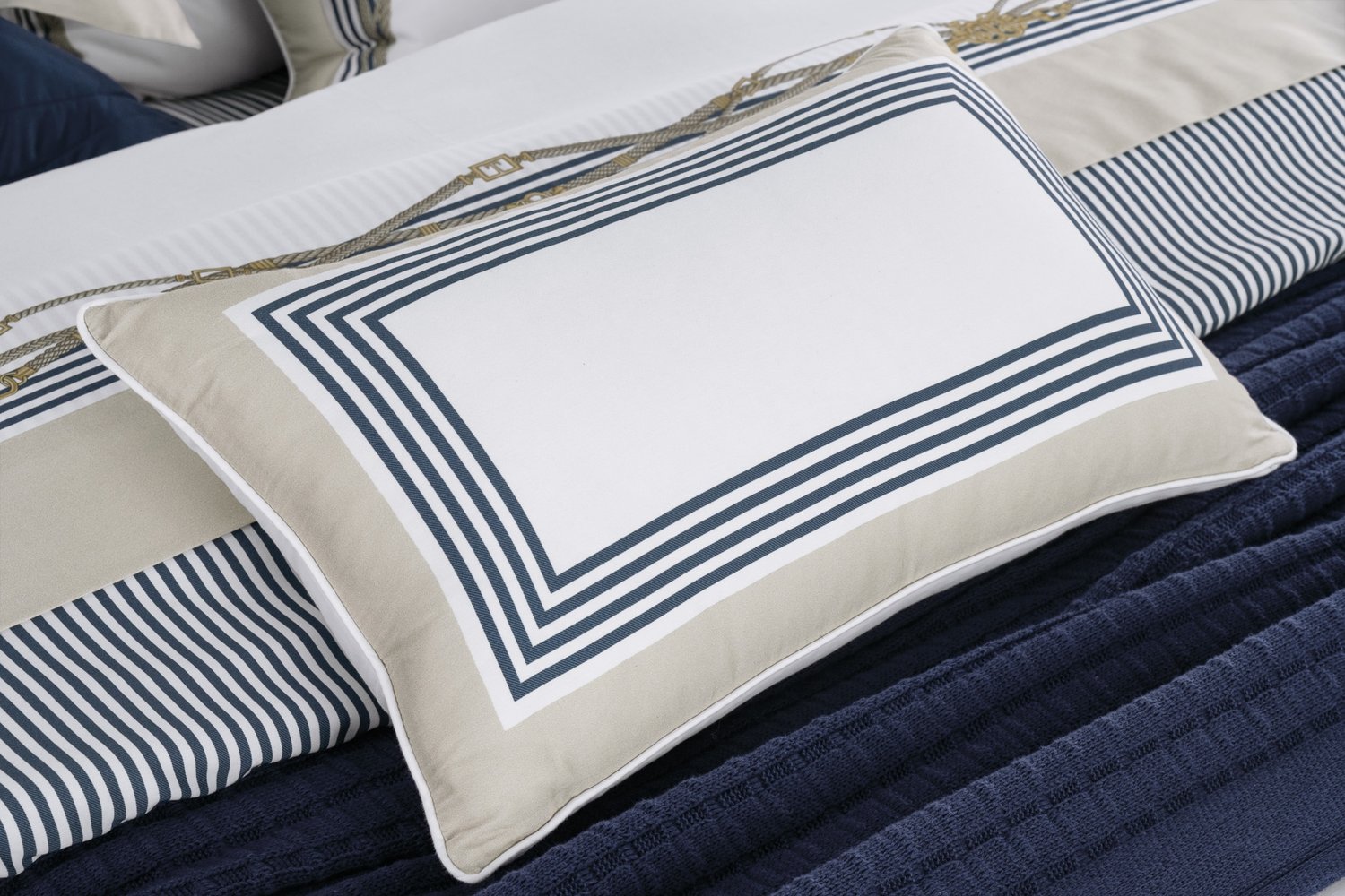 Inspirado na aura náutica e eterna de La Cala di Palermo, este jogo de cama traz para o quarto o sopro suave do Mediterrâneo.A estampa, desenhada à mão com a leveza de um traço guiado pelo vento, evoca o charme do antigo porto: cordas trançadas, listras serenas e a dança silenciosa das embarcações da Marina Galizzi, em harmonia sutil entre o ontem e o agora. Mais que um jogo de cama, é um encontro entre arte, tradição e beleza.