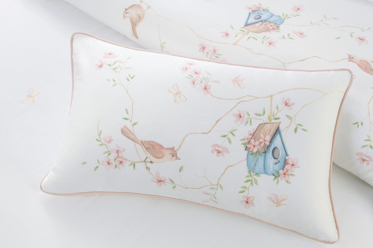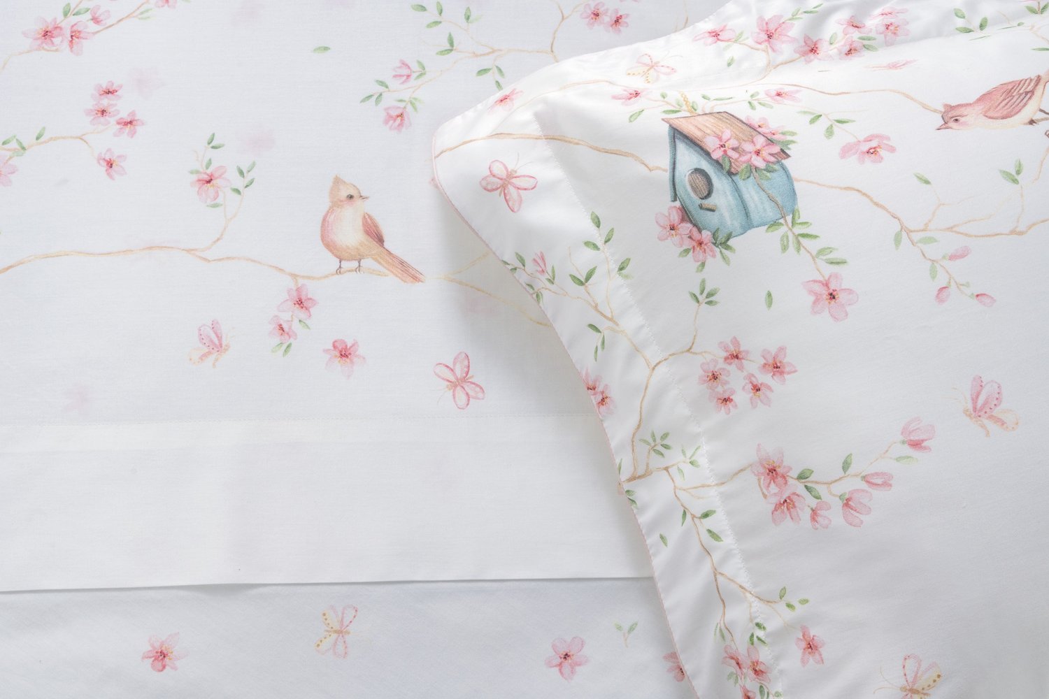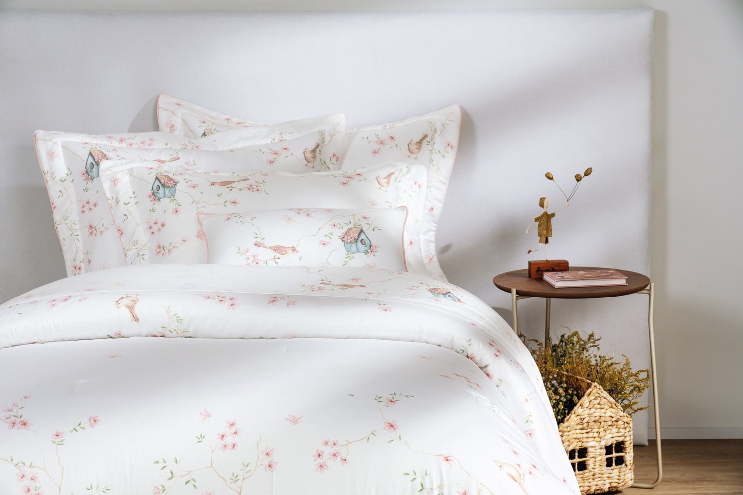 Em meio à delicada florada das amendoeiras, pequenos pássaros encontram abrigo e tranquilidade. A cama Rifugio é um convite doce à imaginação, traduzindo a leveza das flores e a doçura da infância. Suas ilustrações aquareladas, em tons suaves, despertam memórias afetivas e recriam a calma dos dias despreocupados, um refúgio de ternura para momentos de aconchego.