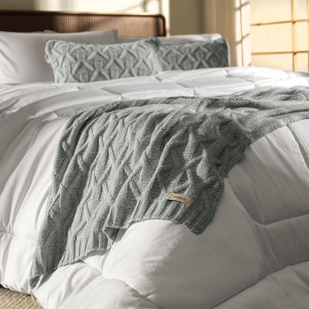 Marca Karsten Modelo Roman Cor Névoa Composição Capa 100% Acrílico, Forro 100% Poliéster Acabamento Tricot com diferentes texturas, Acabamento emoldurado, Almofada com zíper Medidas 30x50 Itens Inclusos 1 almofada