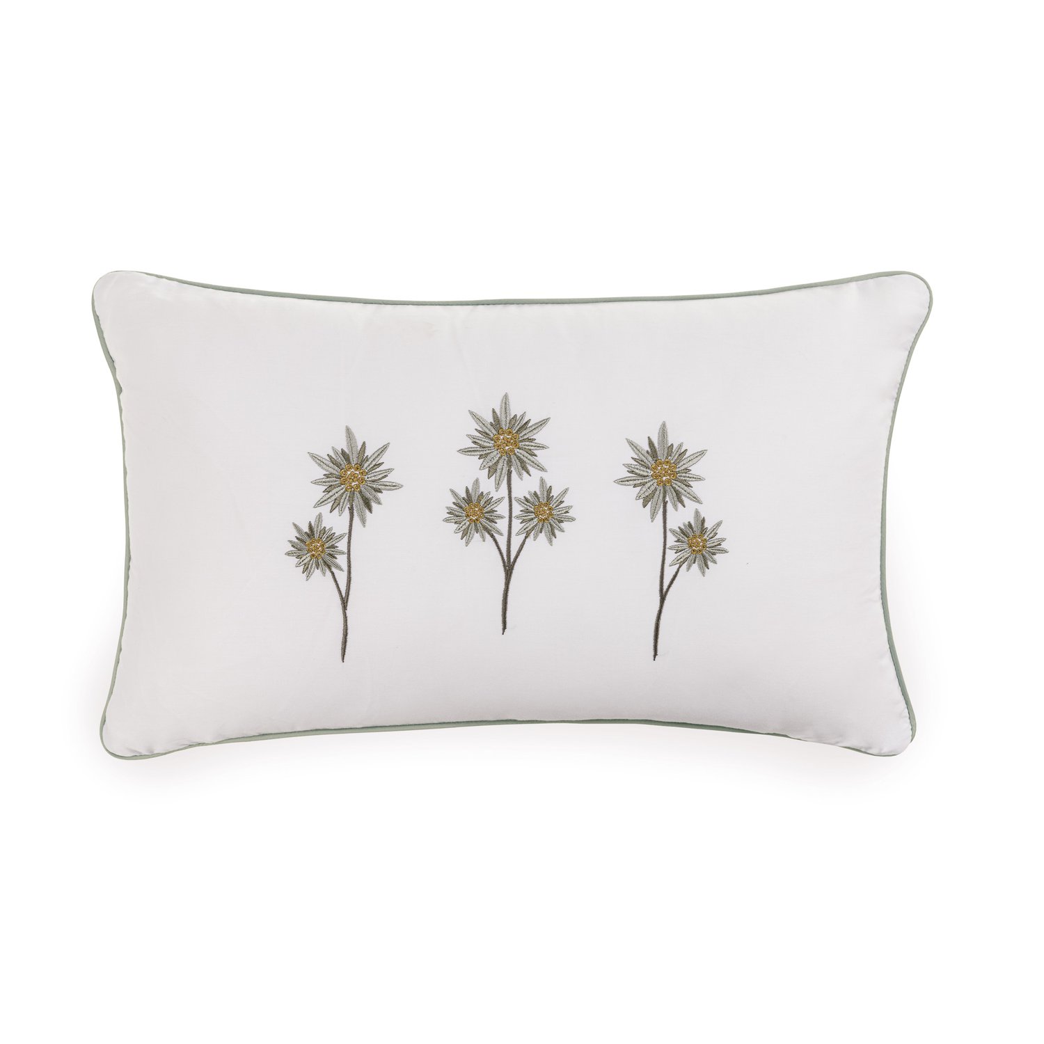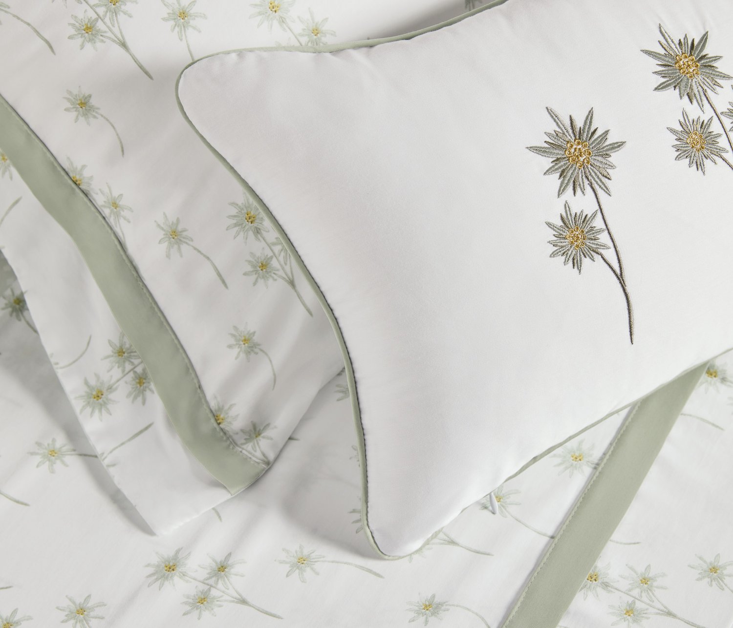 Stella Alpina, também conhecida como Edelweiss, é uma flor que nasce nos alpes italianos e que resiste às baixas temperaturas. Representada com pinceladas fluidas em aquarela, este jogo de cama em 300 fios é meticulosamente confeccionado com modelagem alfaiataria, enriquecida pelo nosso tom verde Pistacchio, conferindo frescor e elegância ao seu momento de descanso.