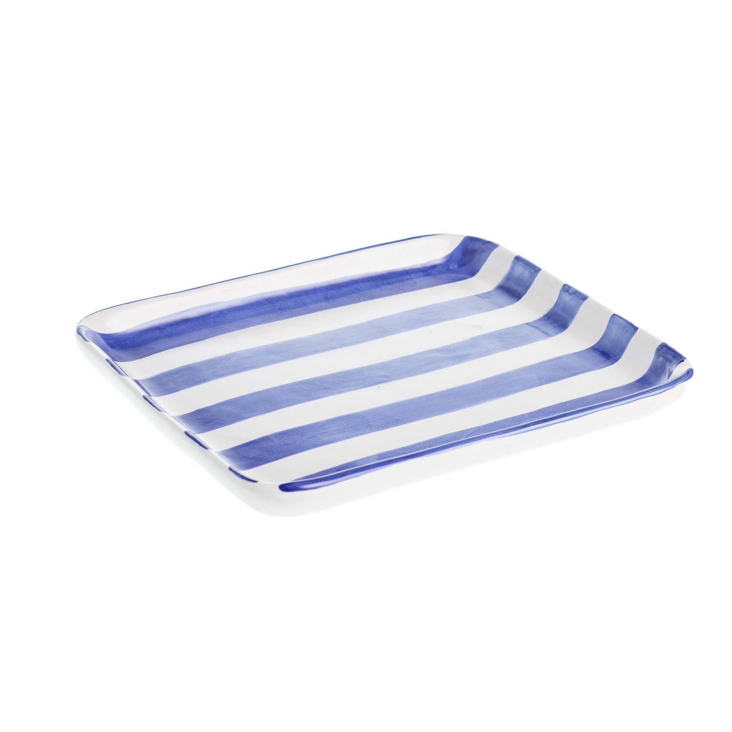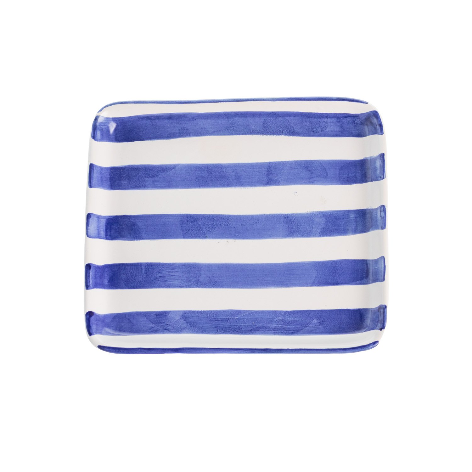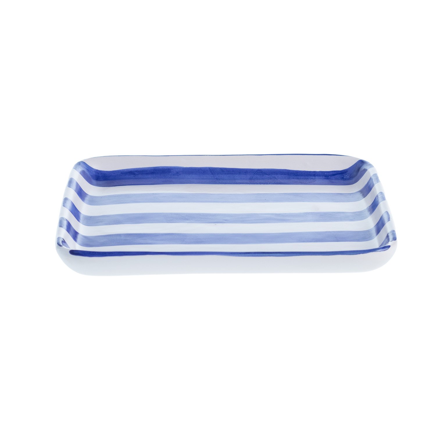 Bandeja retangular, recomendada para apoio de galheteiro, produzida em cerâmica artesanal com pintura manual na cor azul.