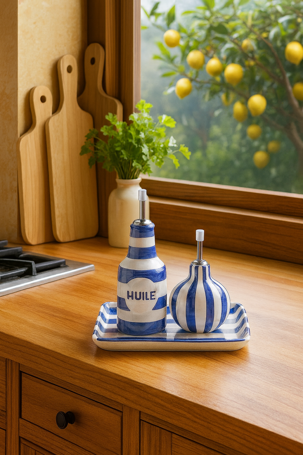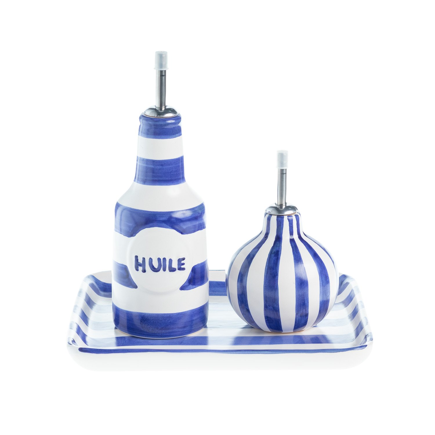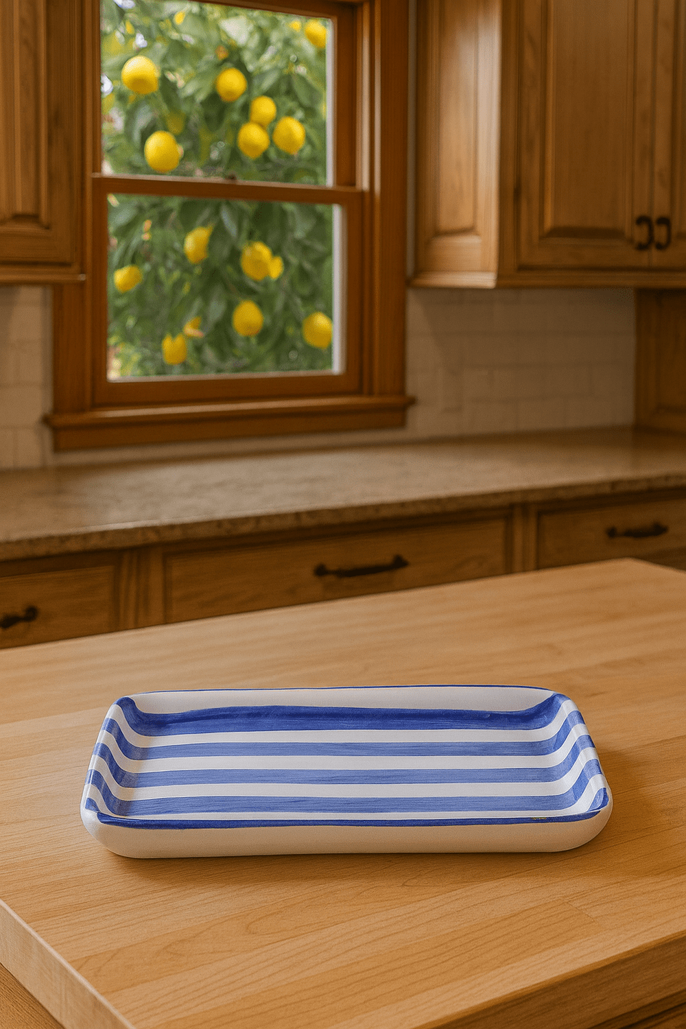 Bandeja retangular, recomendada para apoio de galheteiro, produzida em cerâmica artesanal com pintura manual na cor azul.