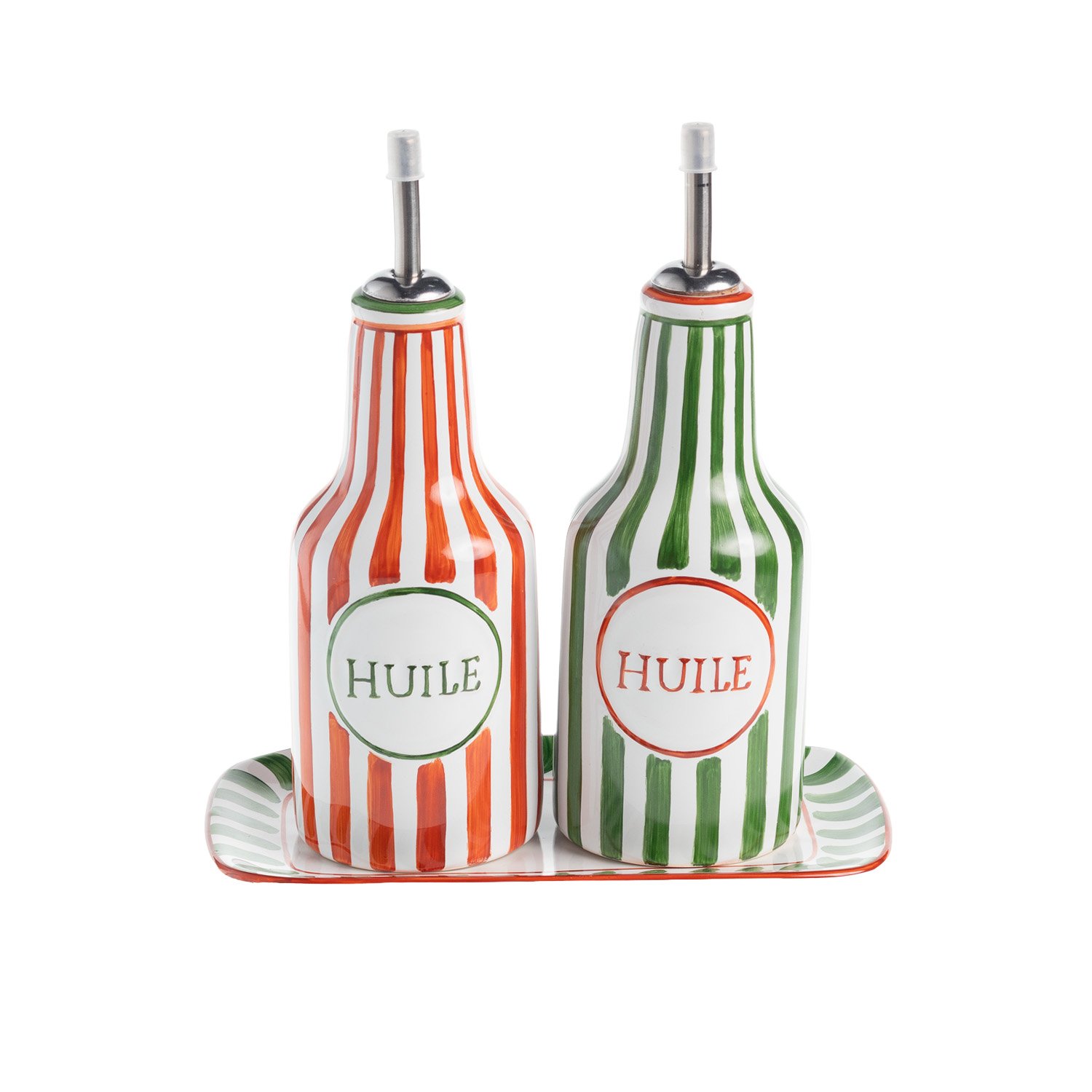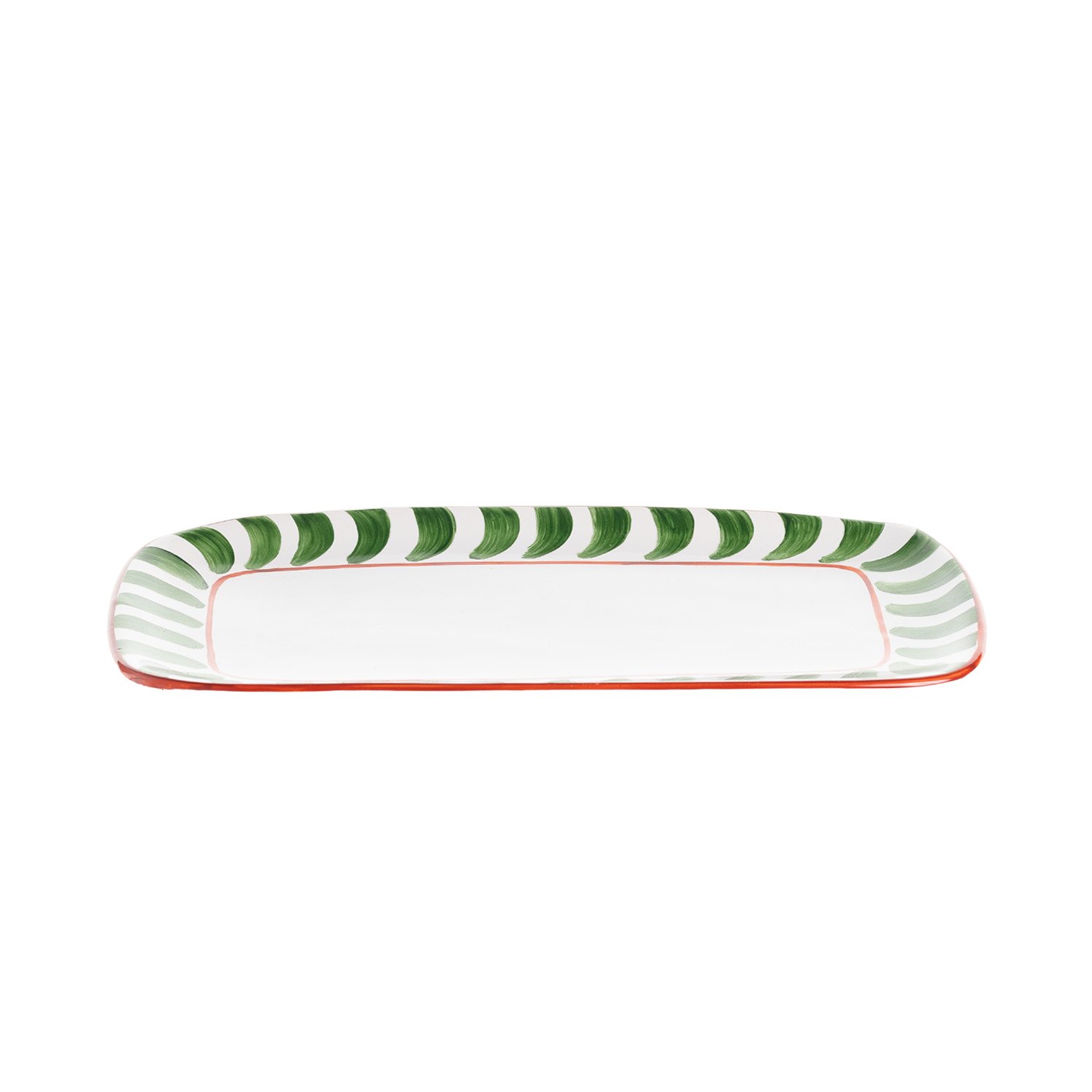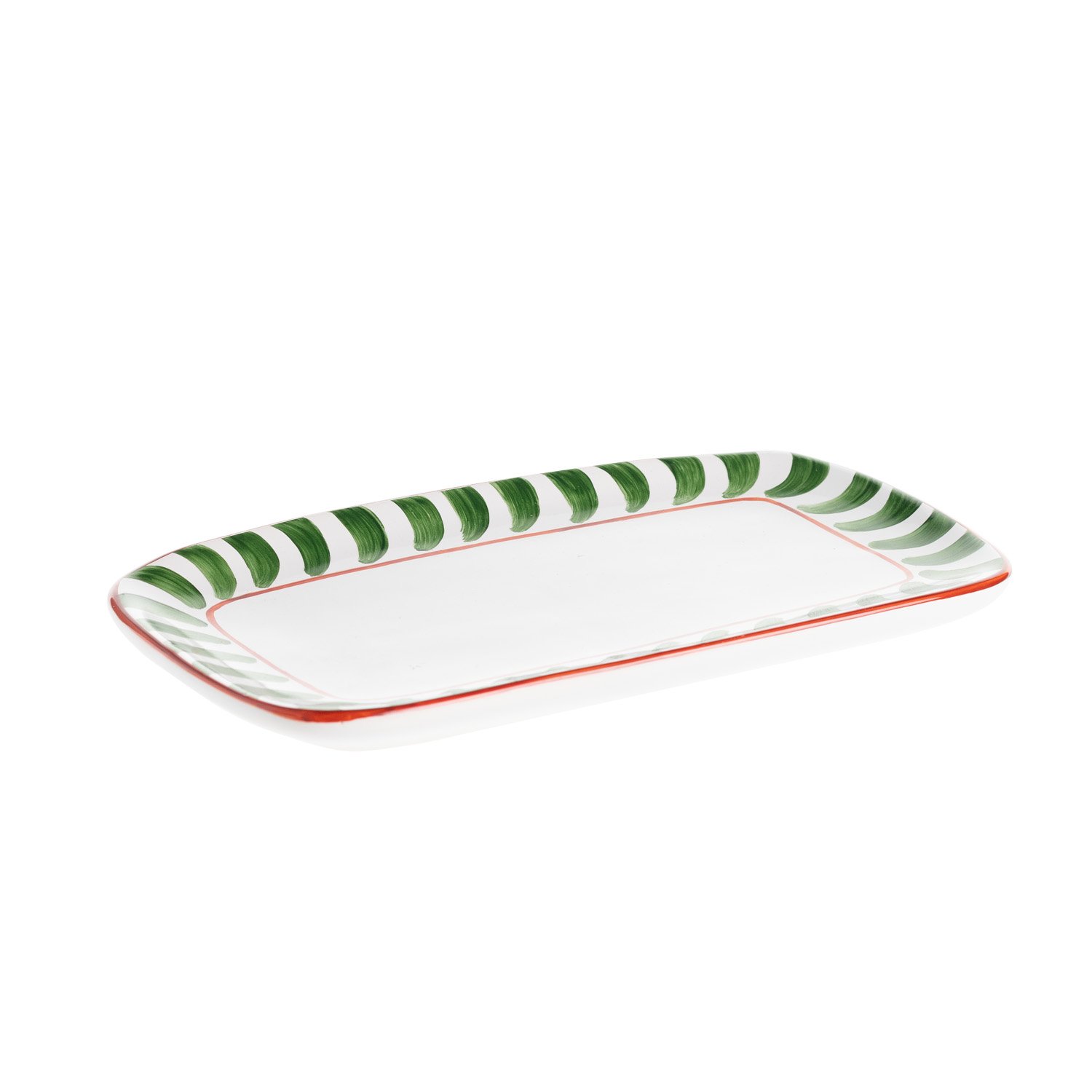 Bandeja retangular, recomendada para apoio de galheteiro, produzida em cerâmica artesanal com pintura manual nas cores verde e vermelho.