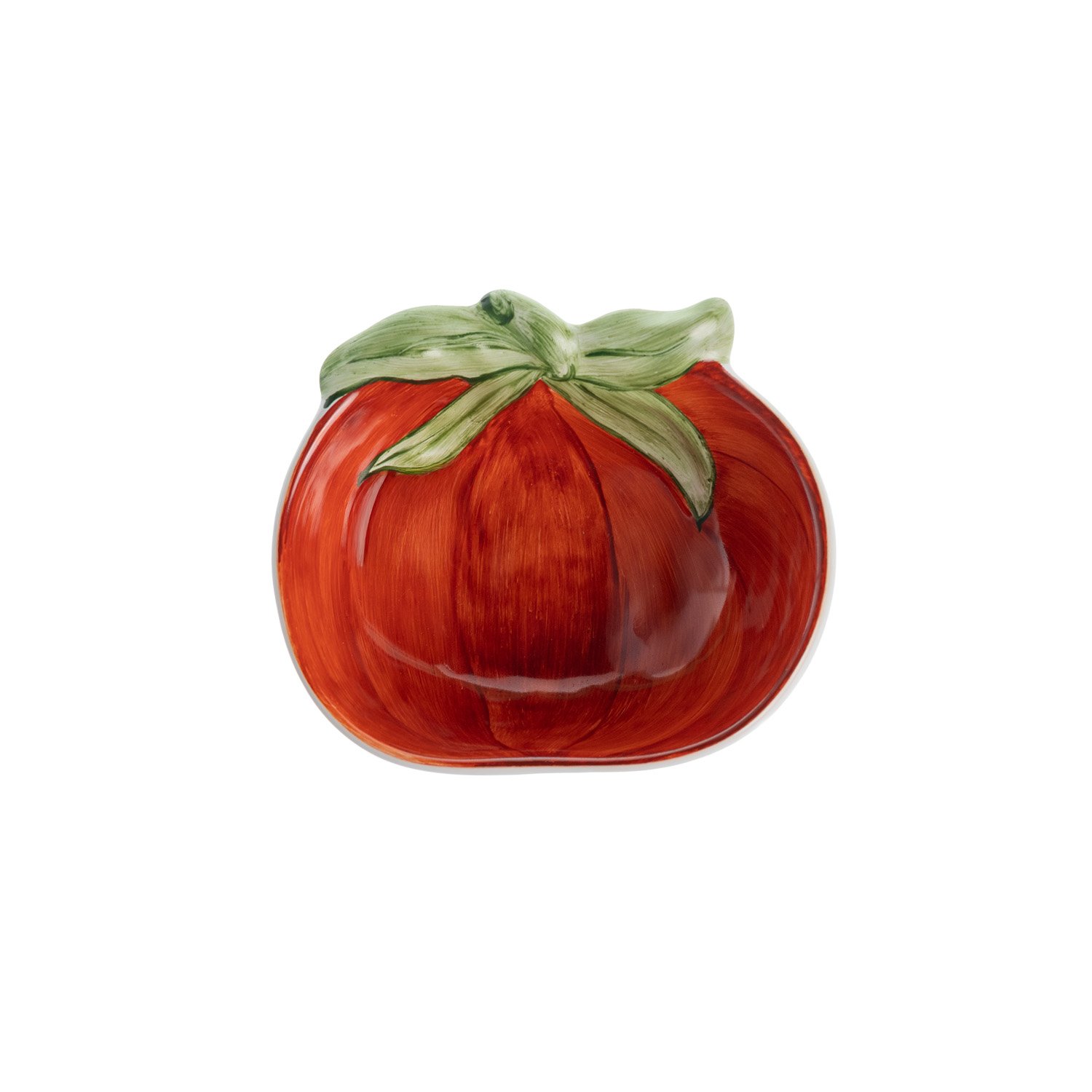 Bowl de cerâmica artesanal com desenho de tomate com pintura manual nas cores verde e vermelho.
