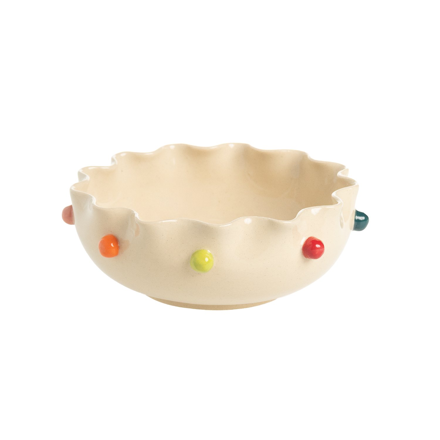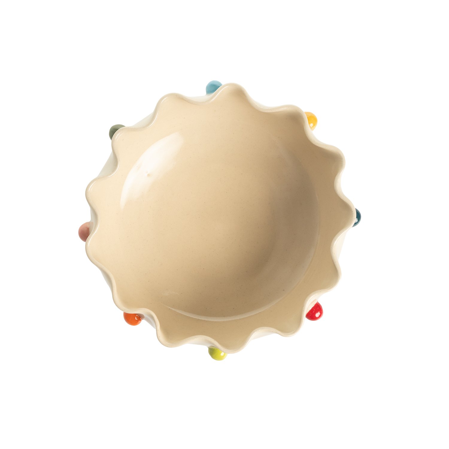 Bowl feito em cerâmica queimada em alta temperatura, com bolinhas esmaltadas no mesmo tom do corpo da peça. A borda ondulada e os detalhes aplicados manualmente tornam cada peça única, charmosa, divertida e cheia de presença.