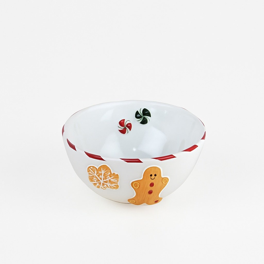 Coleção: Gingerbread Material: Cerâmica / Pintura Manual Acabamento: Alto Relevo Cores: Branco e Vermelho Composição: 01 Bowl Circunferência: 16 cm Altura: 8 cm