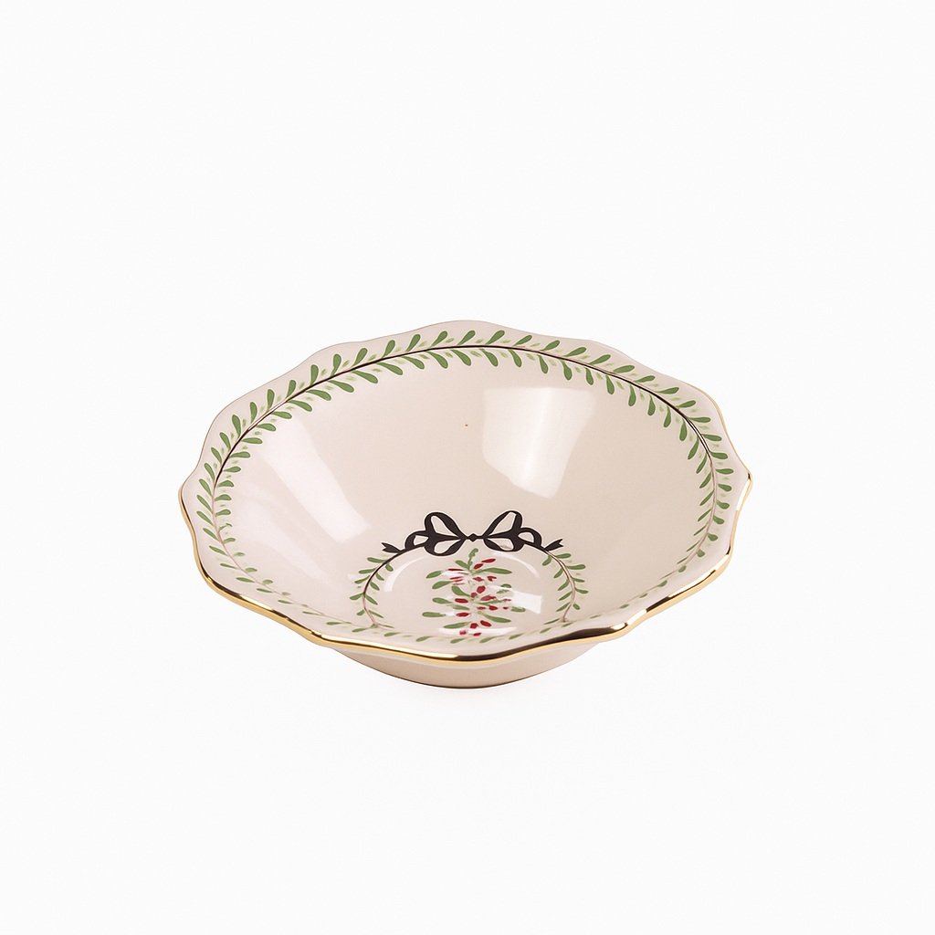 Coleção: Natal Renaissance Material: Cerâmica / Pintura Manual Acabamento: Alto Relevo Cores: Branco e Verde Composição: 01 Bowl Circunferência: 17 cm Altura: 5 cm