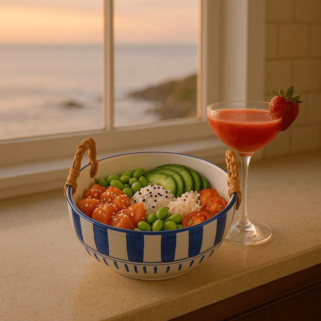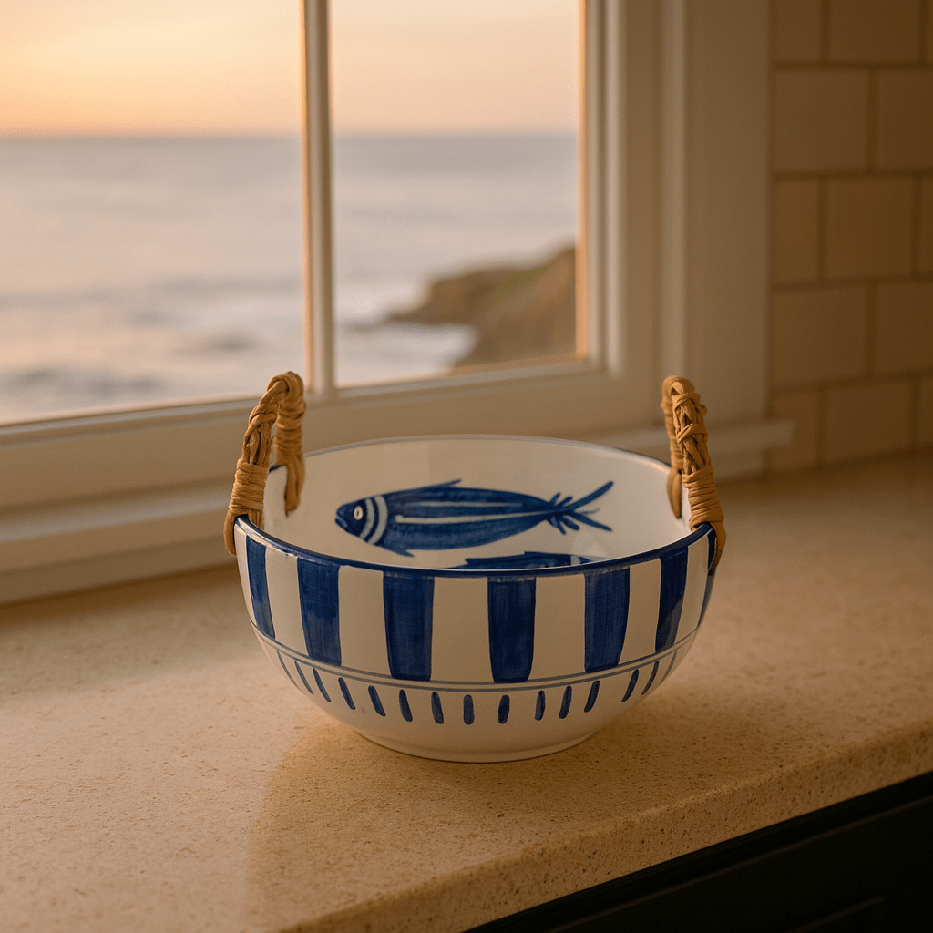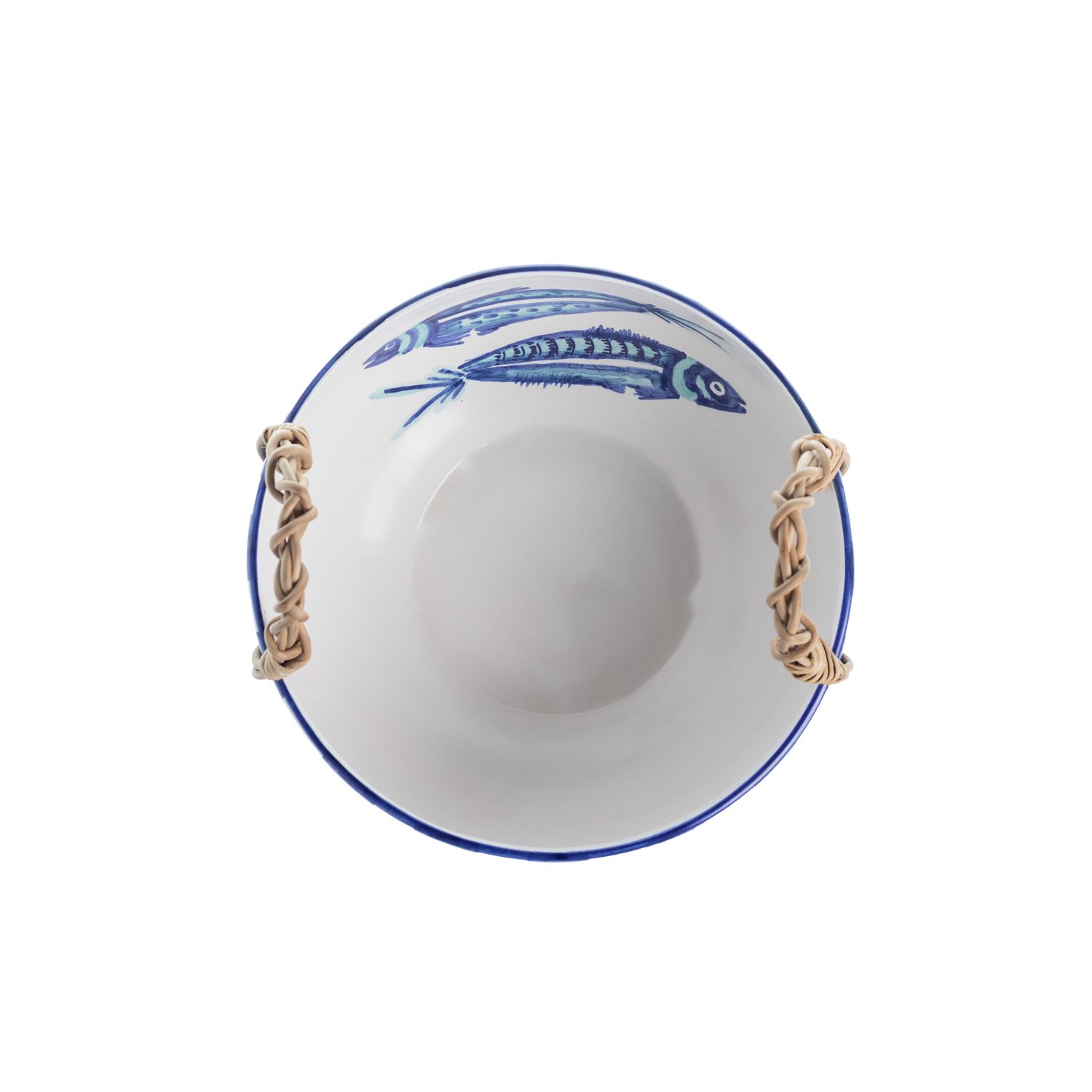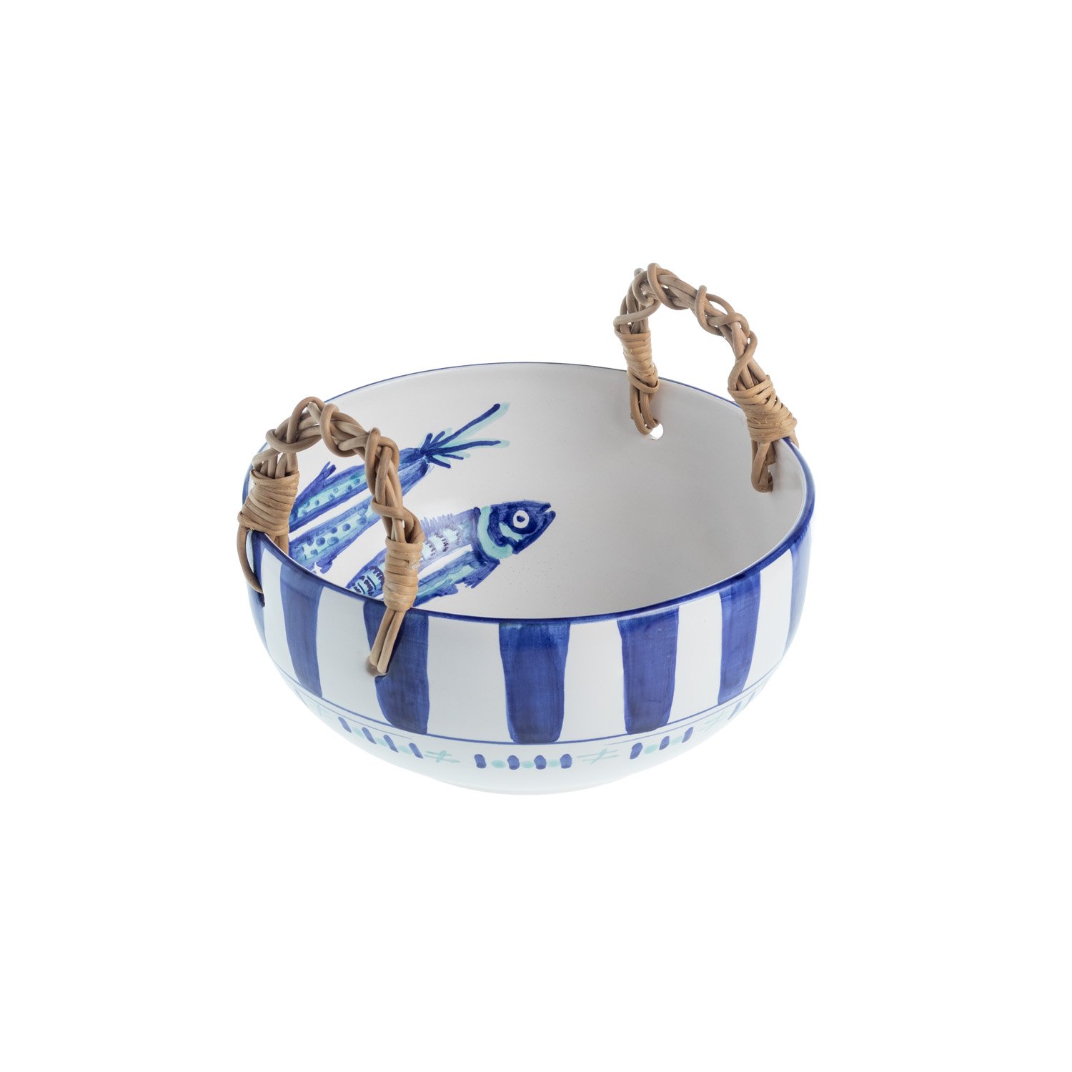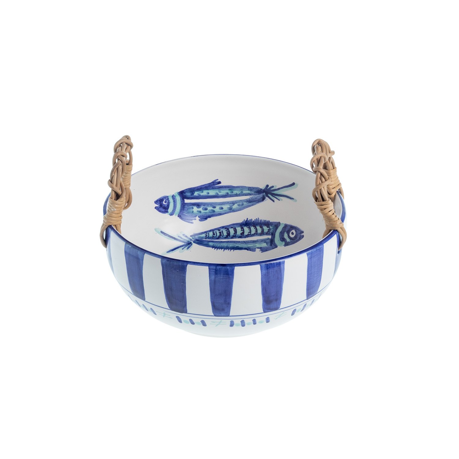 Bowl redondo de tamanho médio com alças em junco, ideal para servir e decorar. Produzido em cerâmica artesanal com pintura manual listrada na cor azul e desenho de peixes.