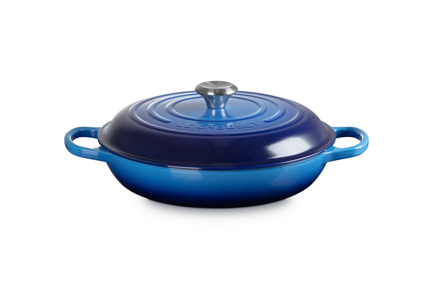 A Caçarola Buffet Signature é um clássico para a sua cozinha. A baixa profundidade da caçarola permite com que o líquido se espalhe melhor para que o alimento ferva ao invés de refogar. Como a caçarola dispõe de uma grande área, o contato do alimento com a fonte de calor é maior, o que se torna ideal para dourar os alimentos antes de cozinha-los. A coleção Signature da Le Creuset chegou com algumas características especiais: alças 45% maiores, fácil aderência e limpeza, interior em esmalte temperado, pegador de aço inoxidável resistente ao calor e uma tampa aperfeiçoada.