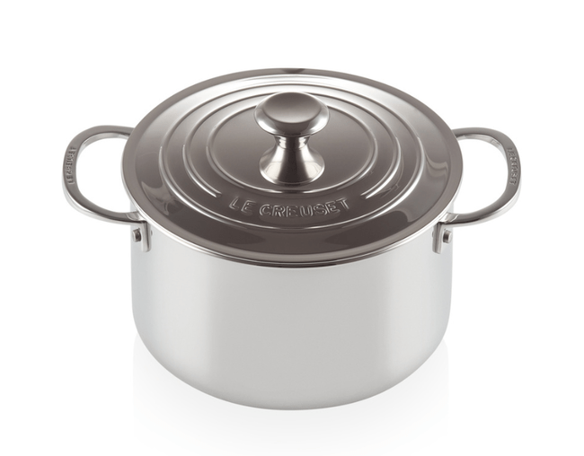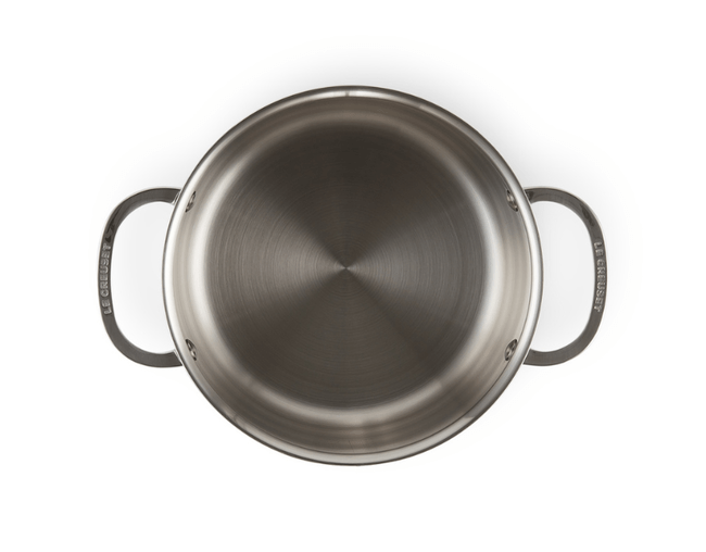 Caçarola da Le Creuset. Feita de aço inox, projetada com 3-Ply, ela conduz e distribui o calor uniformemente, sendo ideal para várias receitas. Possui um núcleo de alumínio que aquece de maneira rápida e uniforme e é protegido pelo aro laminado, vedado e polido. Sua camada externa é magnética e infundida com titânio para resistir à descoloração. Já a camada interna é feita de aço inoxidável de grau cirúrgico para uma superfície de cozimento segura e estável. A peça que faltava em sua cozinha!