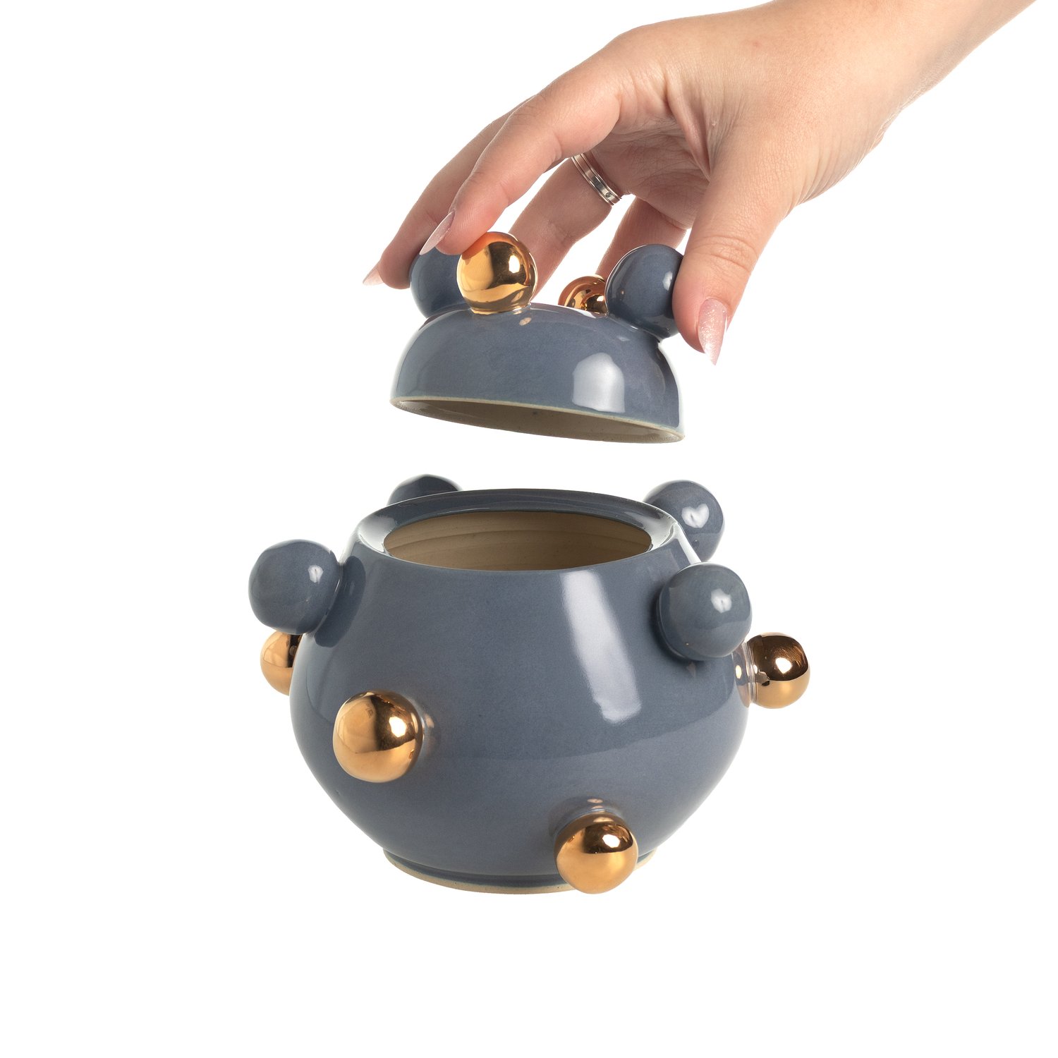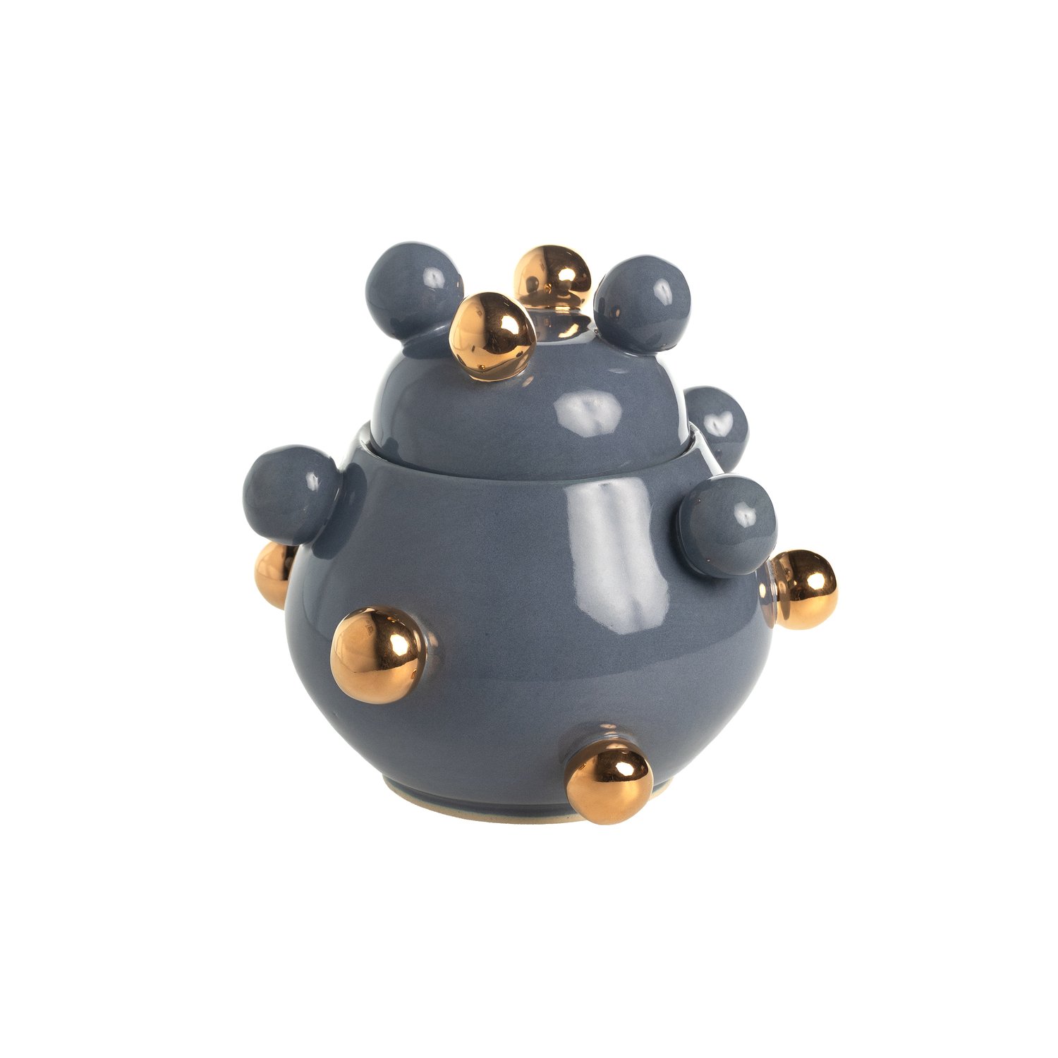 Informações do Produto: Marca: Marô Antunes Cor: Azul Material: Cerâmica Conteúdo: 01 Caixinha Bruxelas Quantidade de Peças: 01 Peça As bolinhas são pintadas em ouro 24K 15,5 cm de diâmetro x 13,5 cm de altura (incluindo as bolotas)
