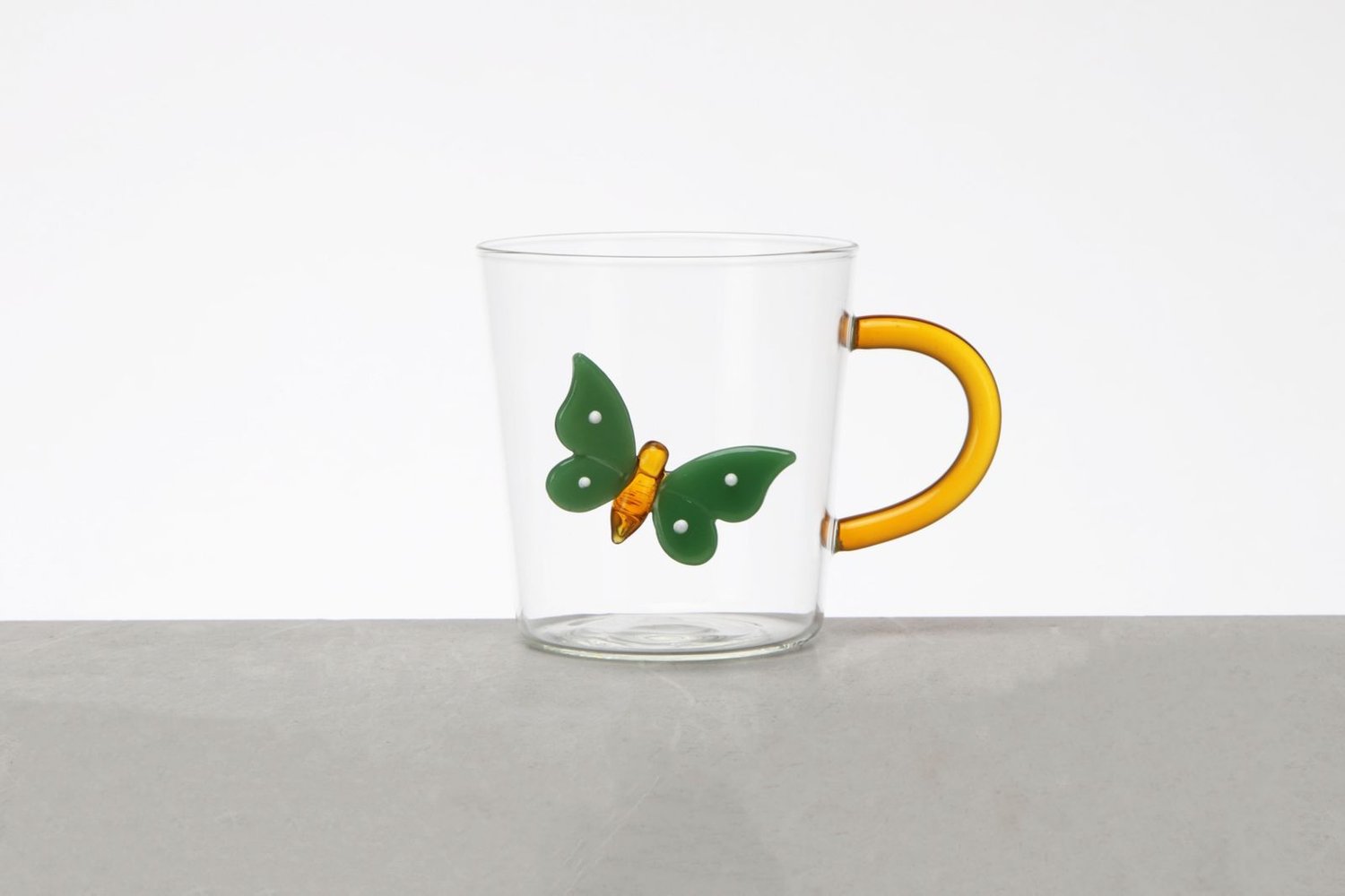 Caneca em vidro borossilicato com alça colorida na cor amarela e borboleta de vidro aplicada em alto relevo nas cores verde e amarelo. Possui capacidade para 320 ml, ideal para servir bebidas quentes ou geladas com charme e elegância.