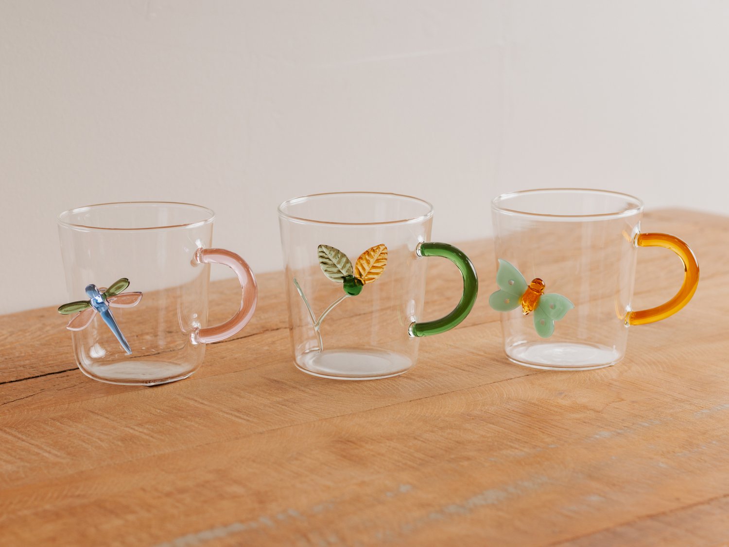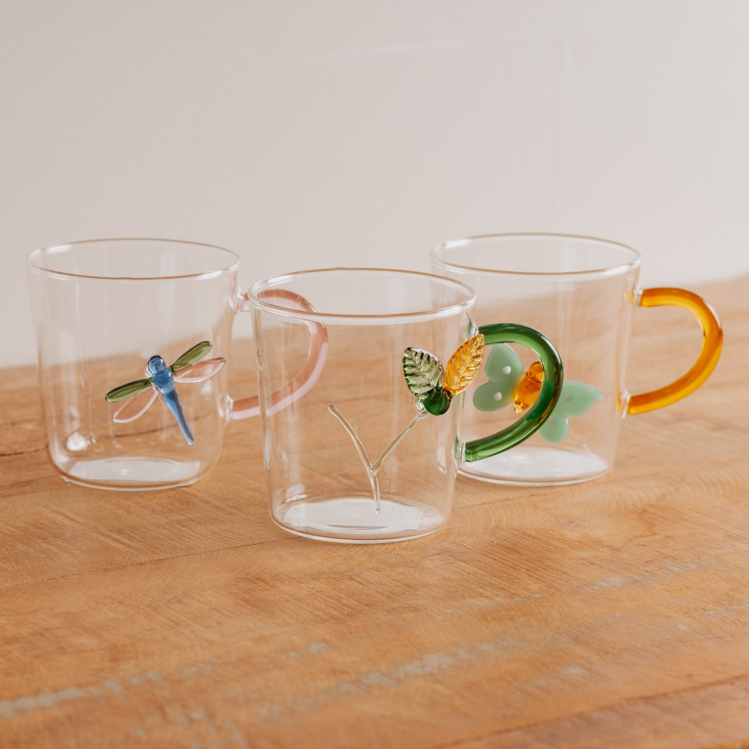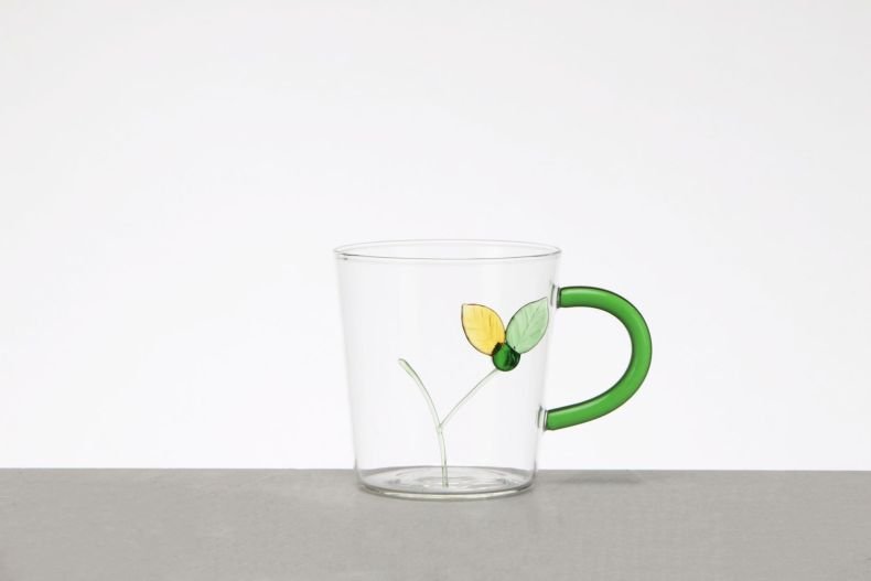 Caneca em vidro borossilicato com alça colorida na cor verde e flor de vidro aplicada em alto relevo nas cores verde e amarelo. Possui capacidade para 320 ml, ideal para servir bebidas quentes ou geladas com charme e elegância.