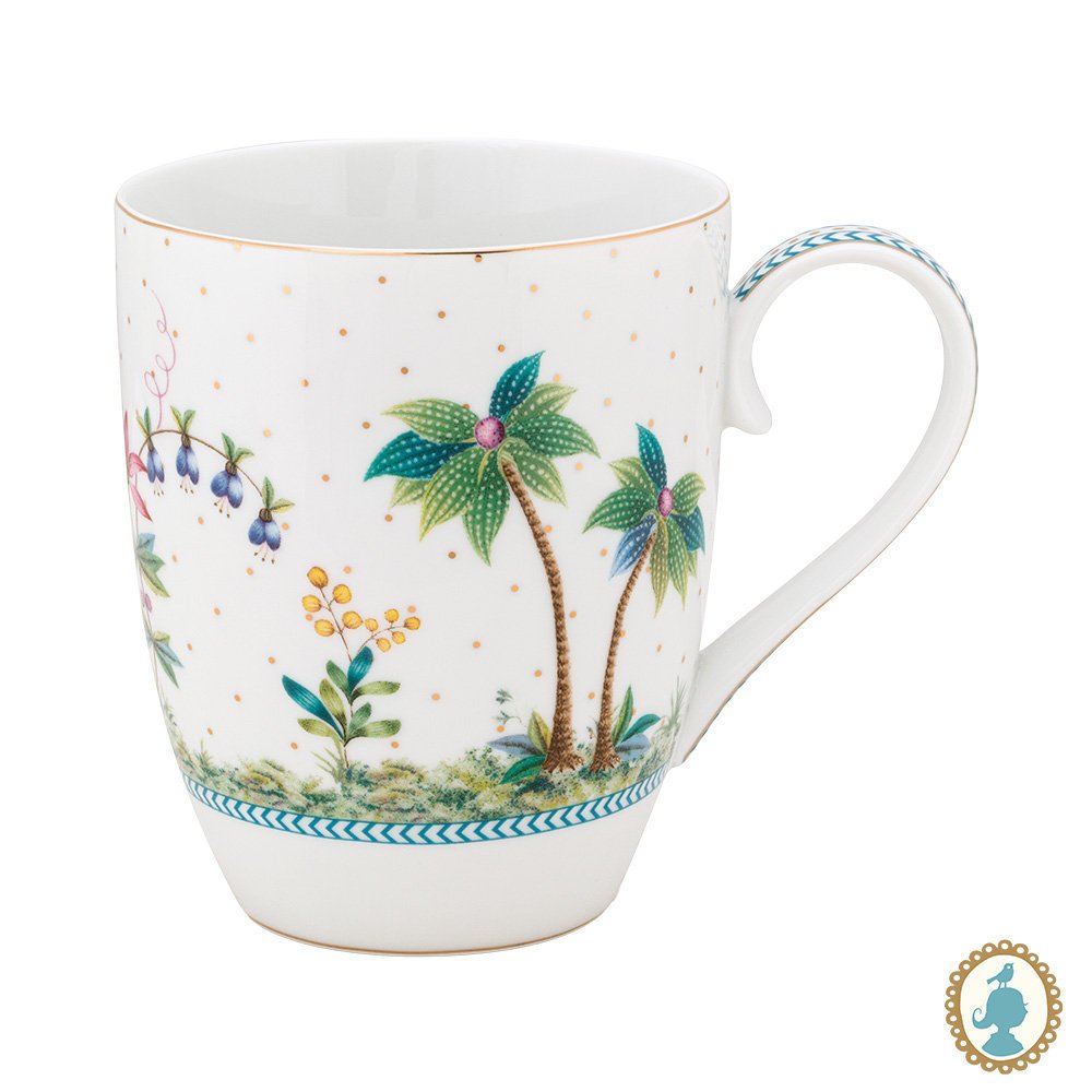 Leve o clima tropical para a sua casa com a coleção Jolie. A estampa alegre e delicada carrega imagens de uma ilha preciosa, um lugar verdadeiramente feliz com várias plantas, flores tropicais, palmeiras e frutas frescas coloridas. Uma rara garça-real branca e outras espécies exóticas são surpreendentemente combinadas com lindas flores prensadas e pontos dourados. O clima festivo da linha Jolie é a cara da Pip Studio.
