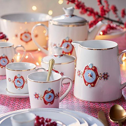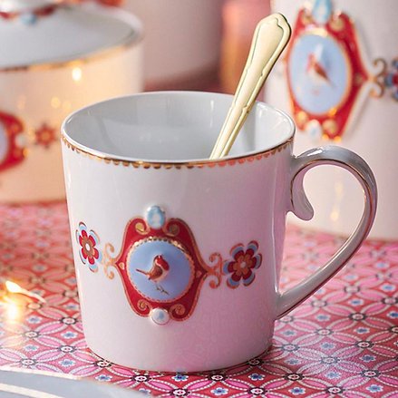 Caneca de porcelana com capacidade de 250ml do design preferido da Pip: Love Birds. O medalhão decorativo em relevo com o passarinho em seu centro dão todo o charme da peça. A caneca é decorada com elementos luxuosos como o acabamento dourado na alça e nas bordas.
