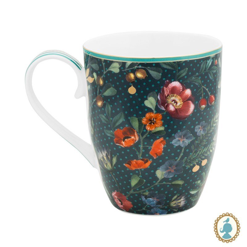 Caneca grande azul escuro de porcelana da coleção Winter Wonderland. Decorada com flores da estação, nozes e um pássaro em dourado. Cada caneca tem capacidade de 350ml e é decorada com elementos luxuosos, como o acabamento da alça em fios dourados.