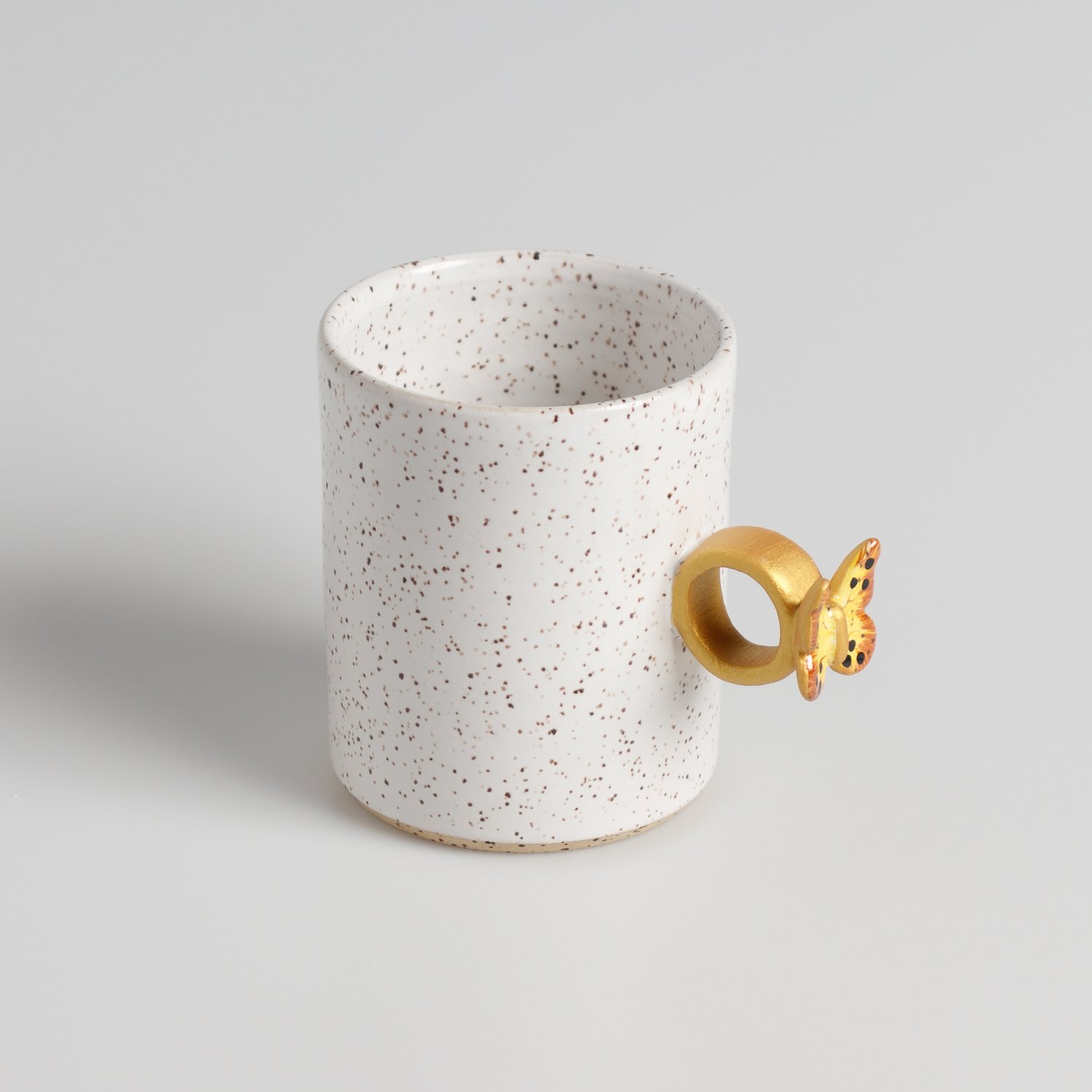 Produzida em cerâmica, moldada e queimada à mão. Essa caneca possui alça pequena na cor dourada e uma delicada borboleta amarela na frente da alça. Uma peça exclusiva e cheia de personalidade.