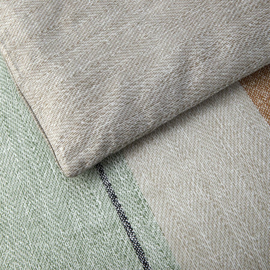 Uma aliança inovadora: a suavidade do cetim de algodão com o estilo texturizado de um tecido de linho em espinha, traduzido em uma impressão. Essa roupa de cama convida para um relaxamento elegante, numa paleta natural, oscilando entre as cores botânicas suaves e densidades minerais. Acabamento curto e liso com babados para as fronhas. Duvet e travesseiros em dupla face, podendo deixar a composição mais colorida ou natural. Feito em cetim de algodão 300 fios.