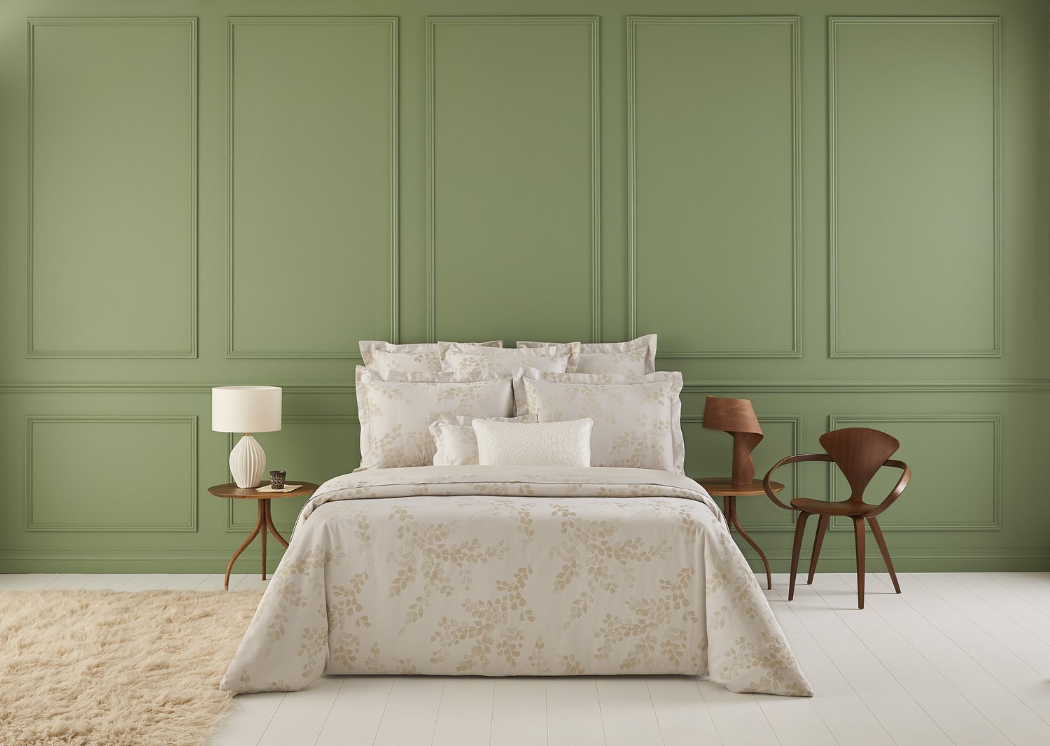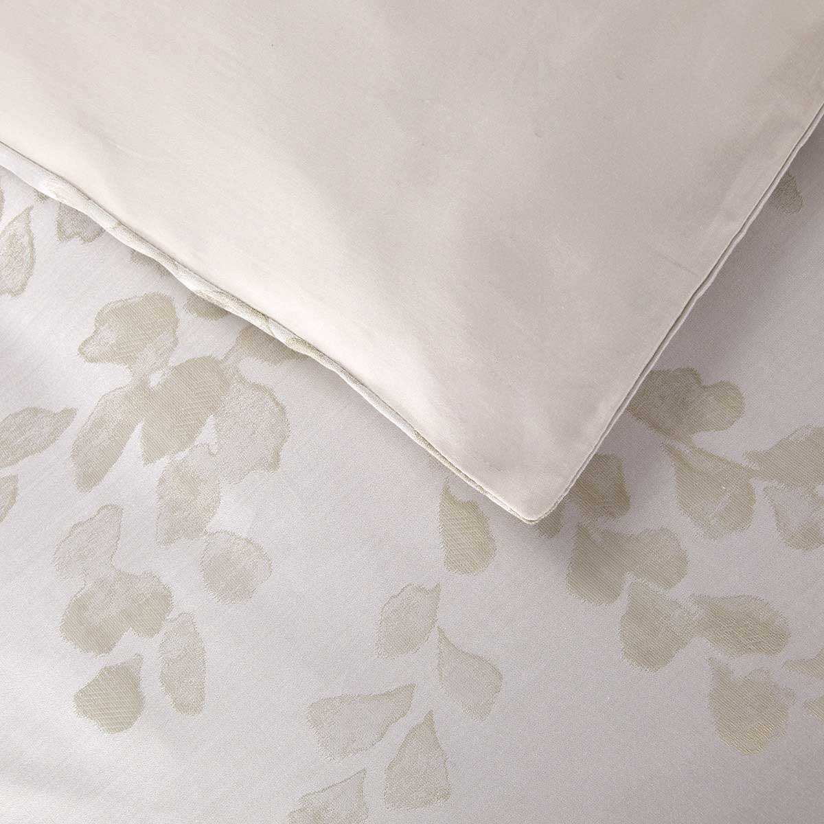 A estampa Murmures, em tecido Jacquard, apresenta folhas ramificadas ao vento, o qual transcreve o movimento e impressão poética da planta em uma elegante tonalidade dourada.