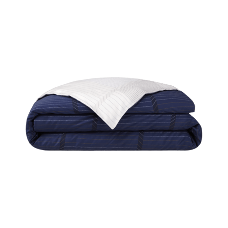 Tomando emprestados os códigos icônicos da marca, esta capa de duvet é estampada em cetim de algodão. As faixas rítmicas seguem umas às outras, um salto no alinhamento engana os olhos, criando um efeito ótico surpresa.