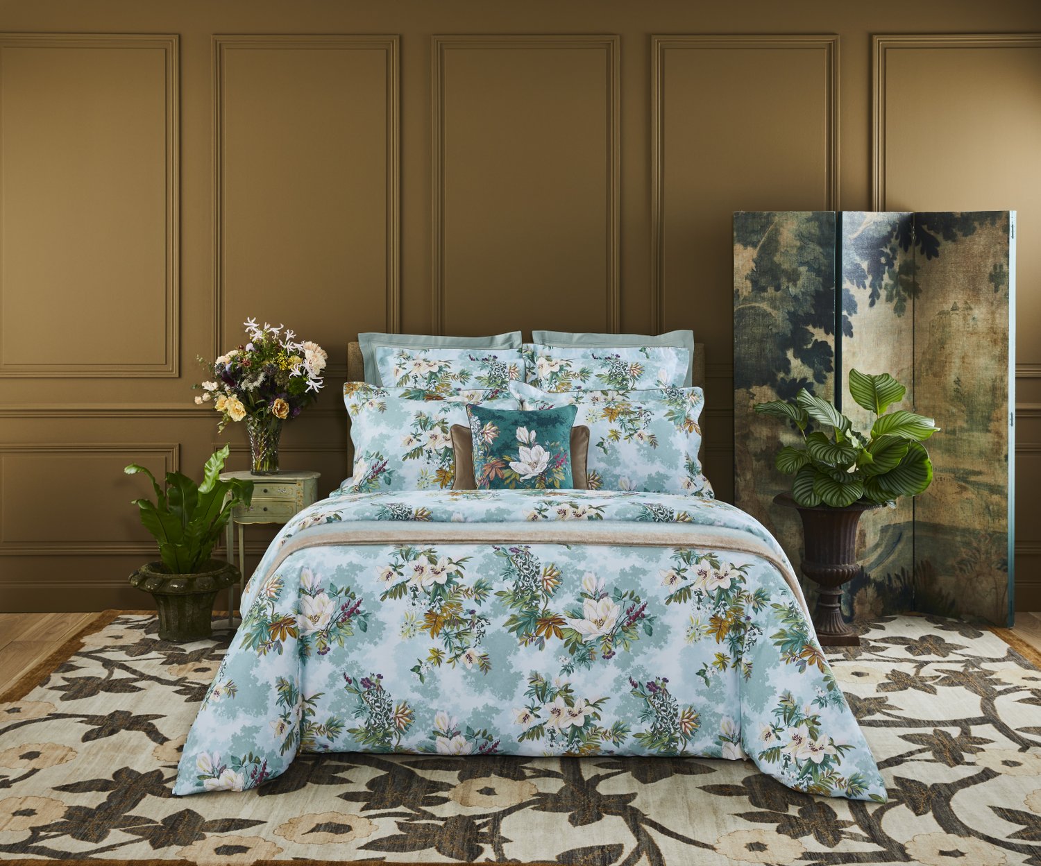 Roupa de cama estampada e dupla face. 100% cetim de algodão orgânico penteado de fibra longa, 300 fios. 15 cores para o desenho principal, 3 cores para o desenho coordenado. Produzido na França.