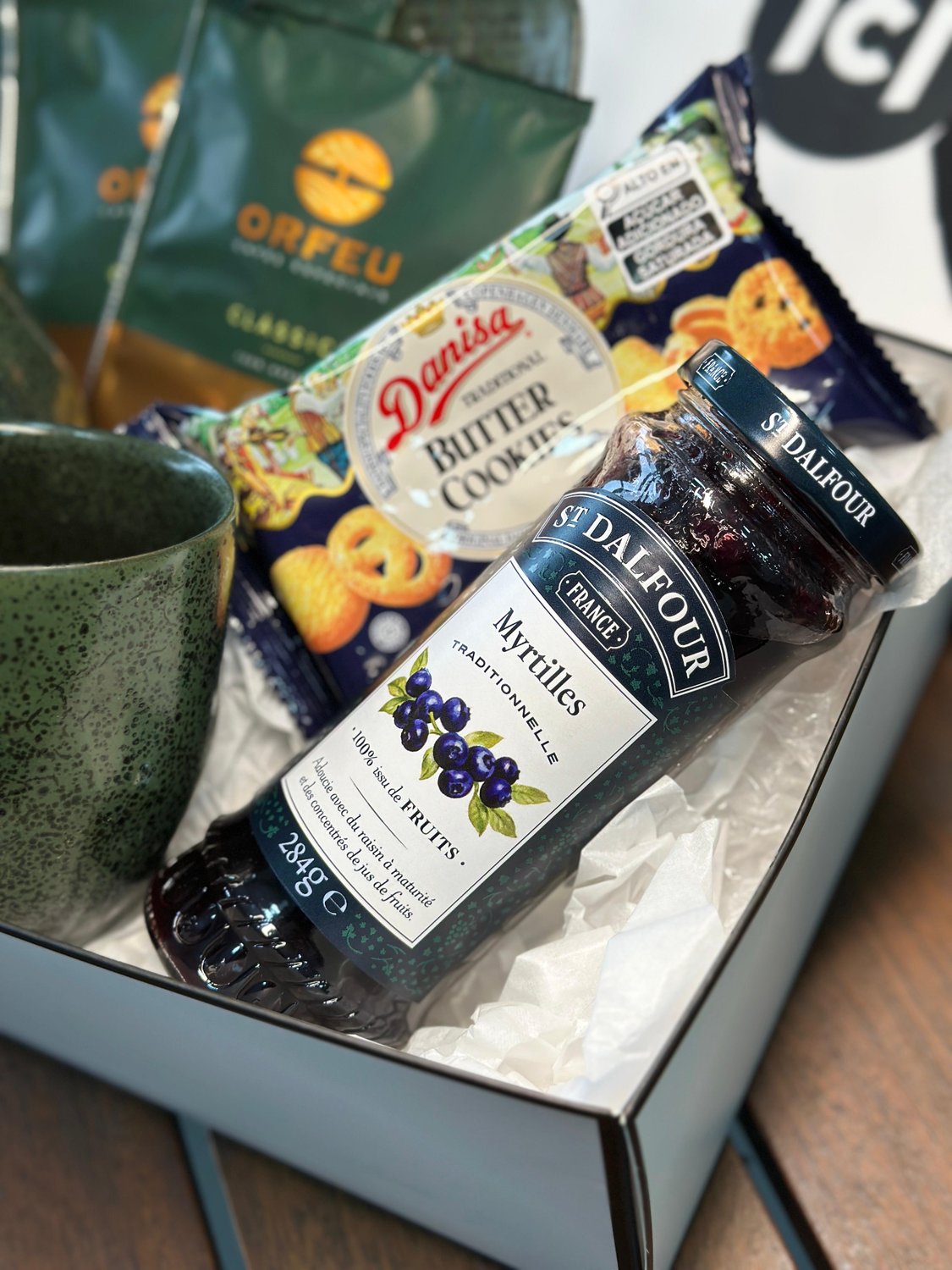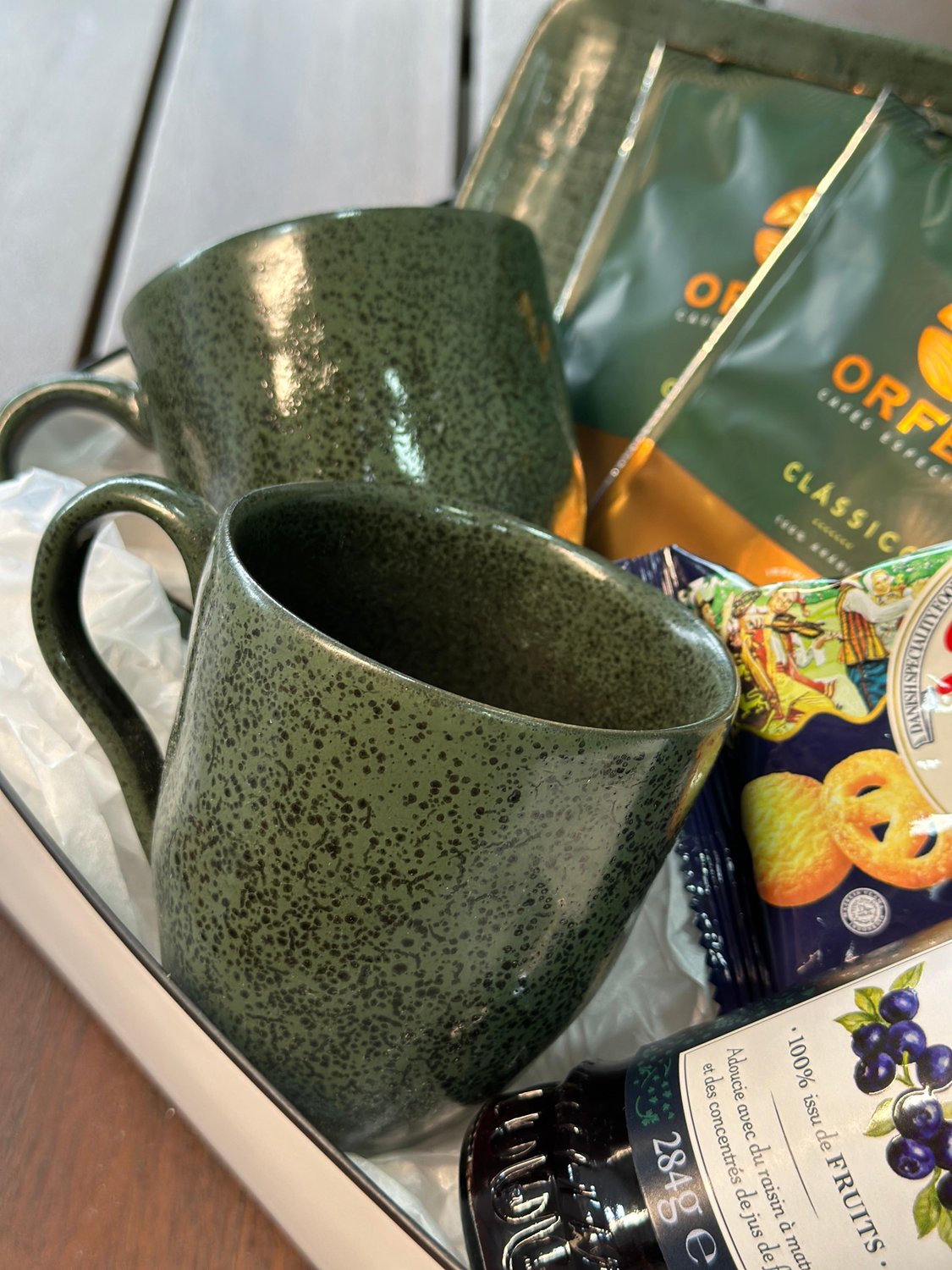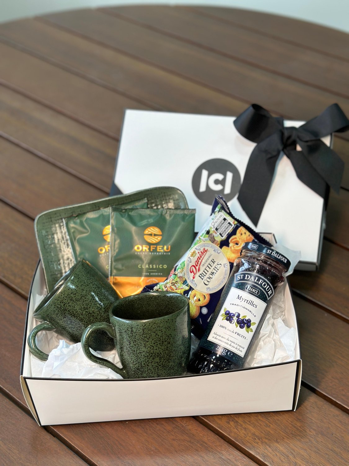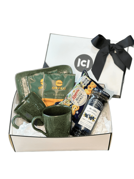 Ideal para presentear, esse kit especial conta com duas canecas de carâmica, uma travessa, dois sachês de café, um pacote de biscoitos amanteigados e uma geléia sem açúcar. Para encantar os amantes de café, este set vem em uma caixa reutilizável, pronta para presentear.