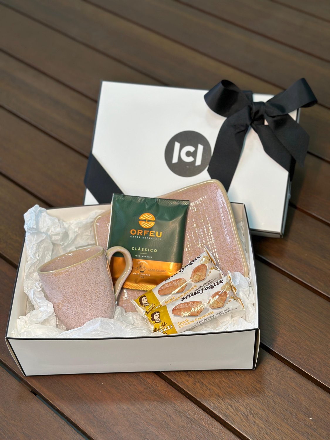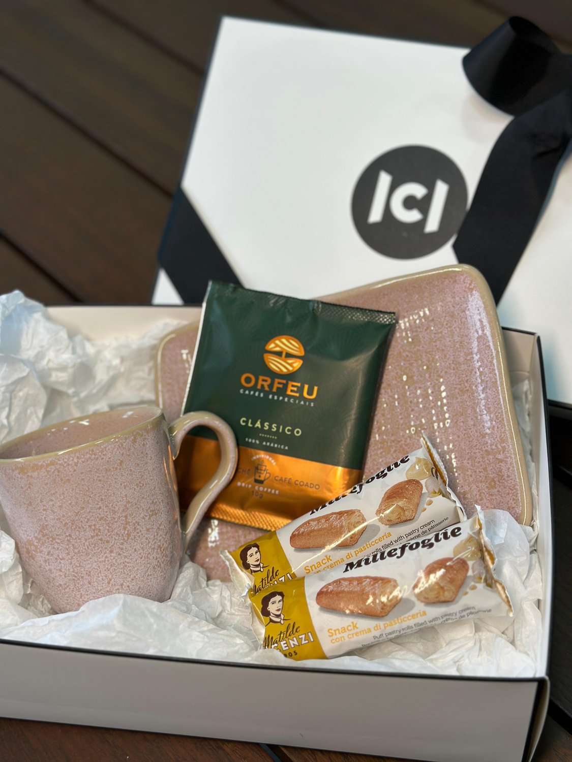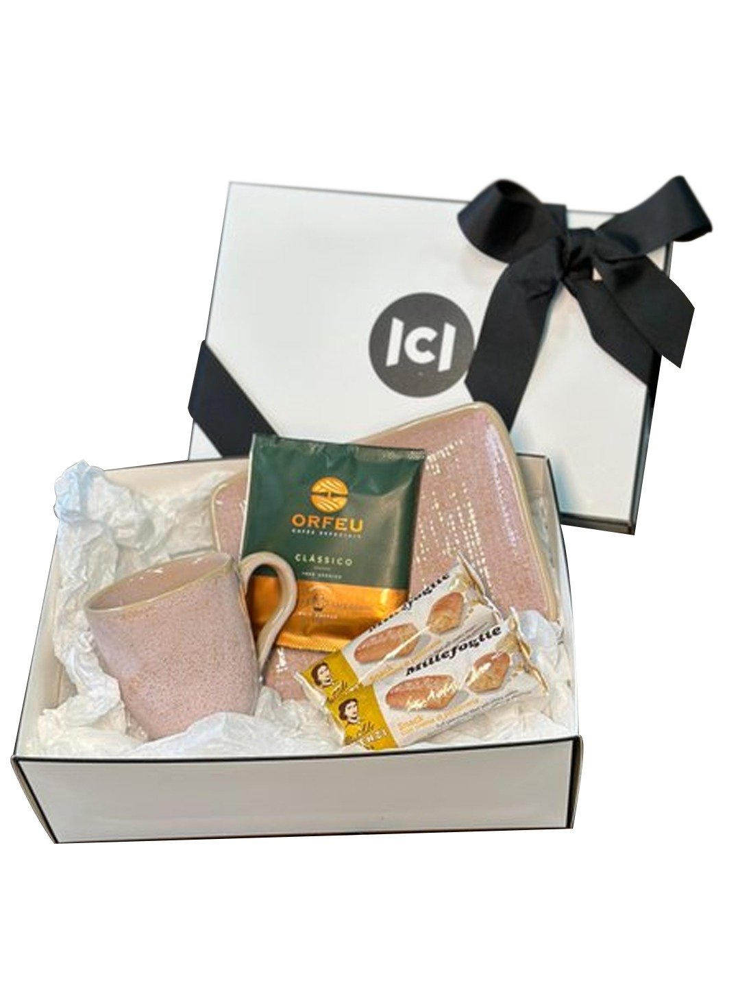 Esta cesta variada para a hora do café inclui uma caneca em cerâmica e uma travessa para compor, além de um sachê drip coffee Orfeu e dois folhados com creme. Envie essa cesta para alguém especial ou use-a para trazer mais sabor para sua tarde.