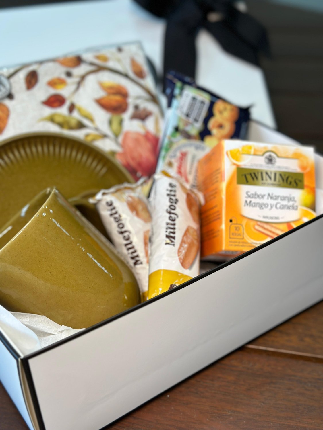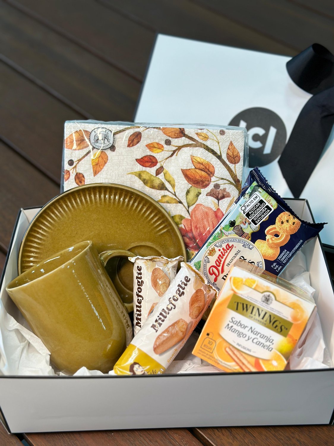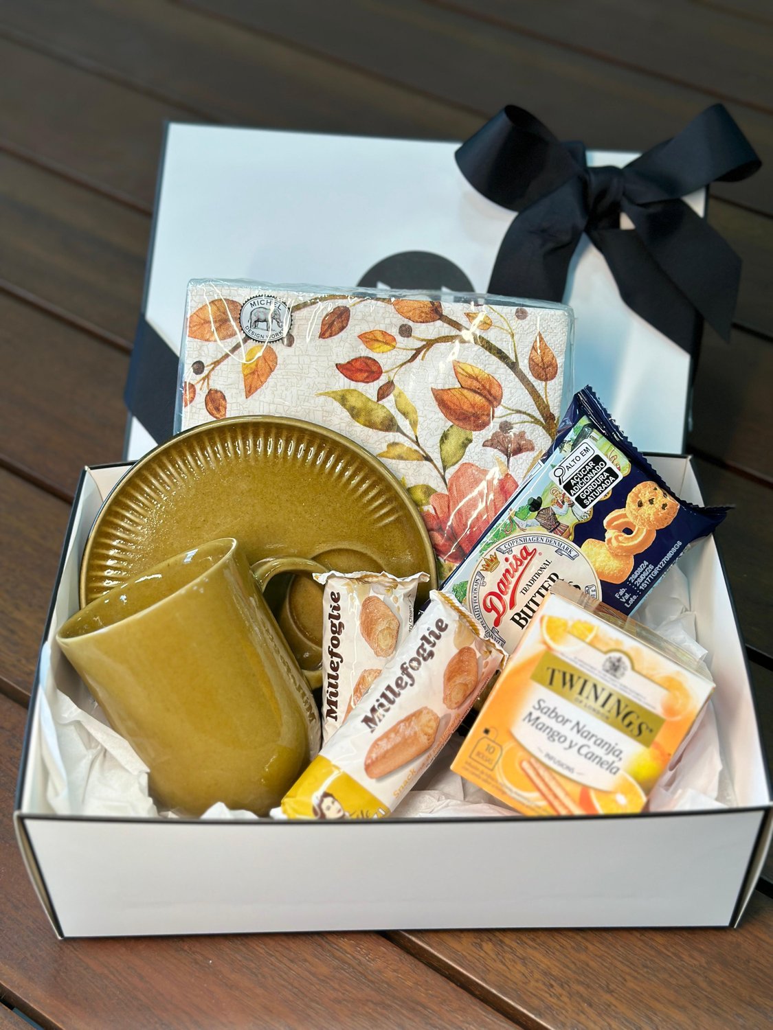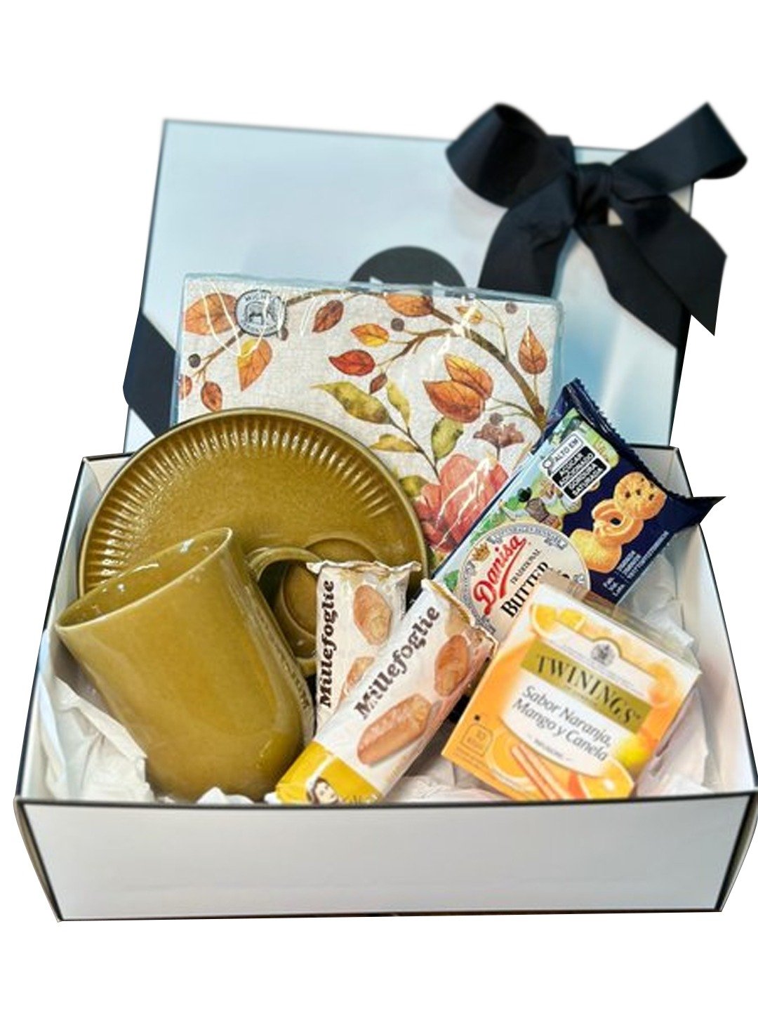 Para aqueles dias de outono onde tudo que queremos é um chá e biscoitos em uma linda mesa. Esta cesta variada inclui uma caneca 330ml com pires em cerâmica, um pacote de guardanapo temático Outono, uma caixa e chá Twinings, biscoitos amanteigados e dois folhados deliciosos. Envie essa cesta para alguém especial ou use-a para trazer mais sabor para sua tarde.