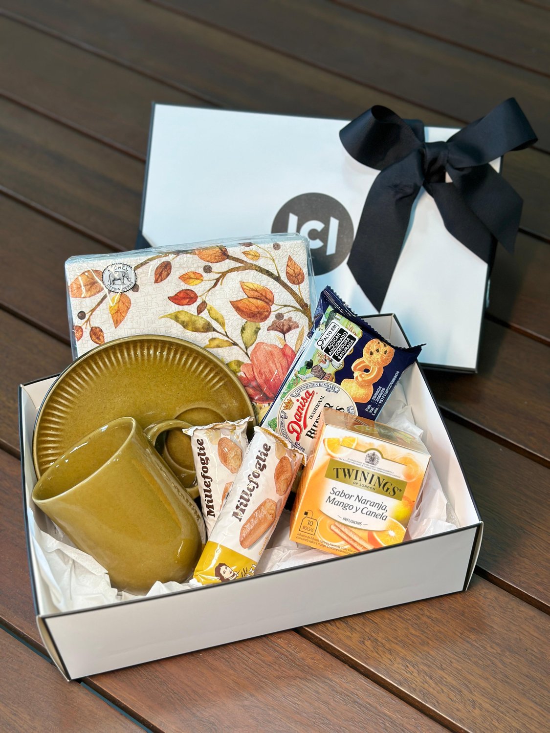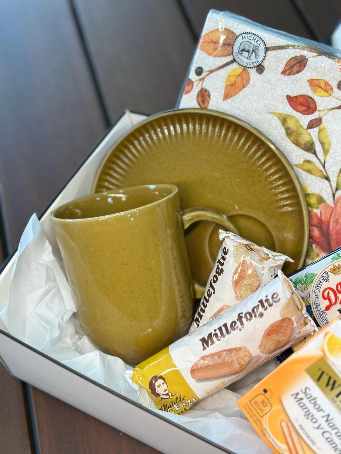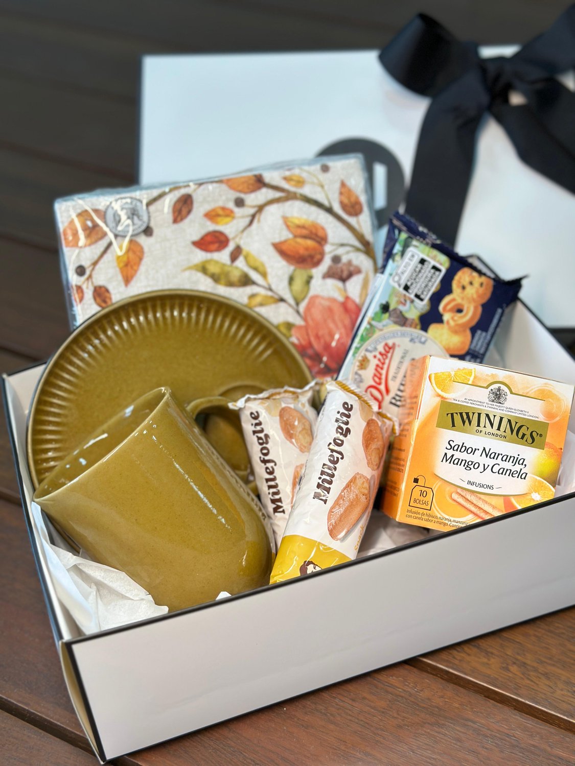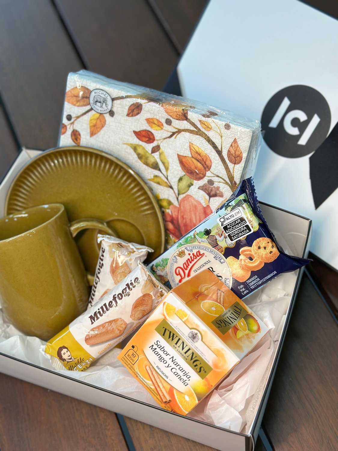 Para aqueles dias de outono onde tudo que queremos é um chá e biscoitos em uma linda mesa. Esta cesta variada inclui uma caneca 330ml com pires em cerâmica, um pacote de guardanapo temático Outono, uma caixa e chá Twinings, biscoitos amanteigados e dois folhados deliciosos. Envie essa cesta para alguém especial ou use-a para trazer mais sabor para sua tarde.