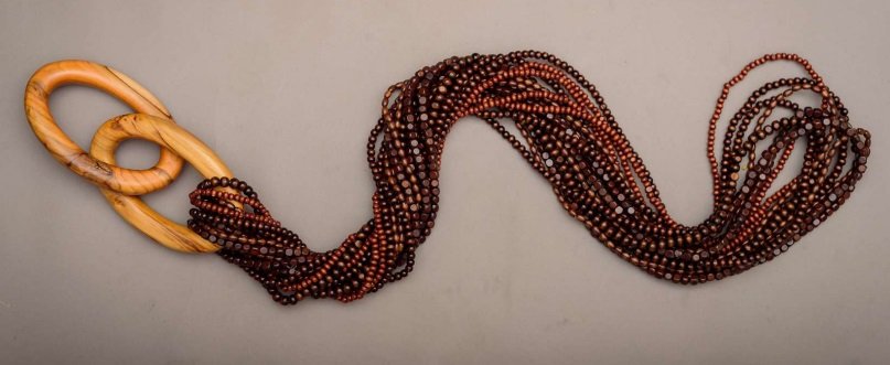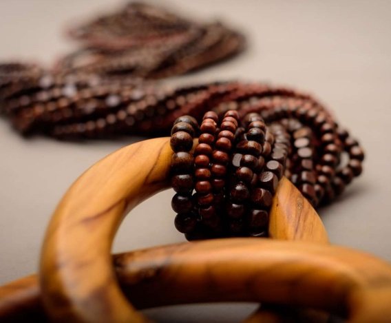 Colar produzido manualmente em madeira teca e contas na cor marrom.