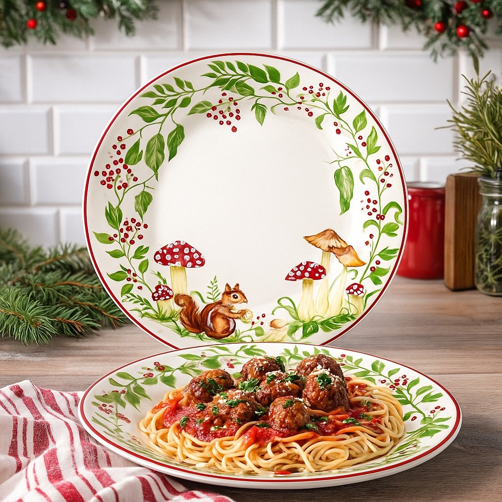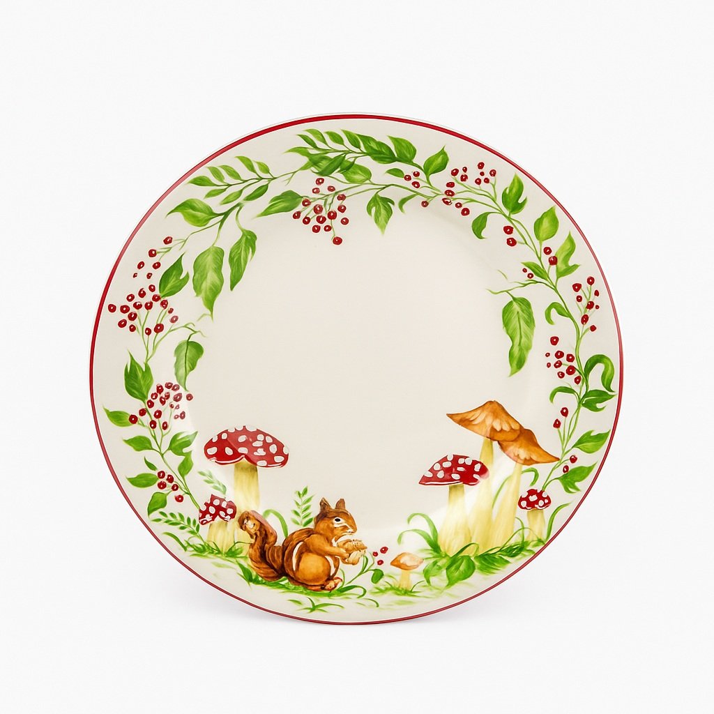 Coleção: Esquilo na Floresta Material: Cerâmica / Pintura Manual Acabamento: Alto Relevo Cores: Branco, Vermelho e Verde Composição: 04 Pratos de Jantar Circunferência: 27 cm Altura: 3 cm