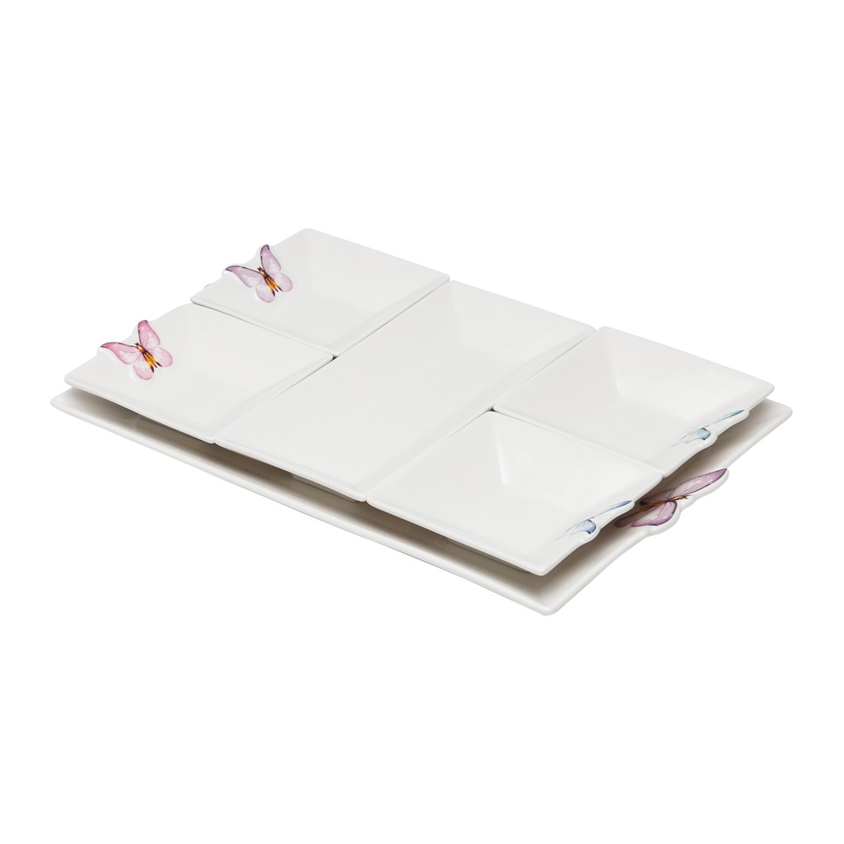 Os produtos da Linha Borboletas da Wolff são puro charme e elegância. Possuem delicados detalhes de borboletas, dando muito mais beleza para a peça. O conjunto de Petisqueiras é super versátil, ele possui 05 petisqueiras e mais uma bandeja. Seu design é super moderno, ideal para várias ocasiões.