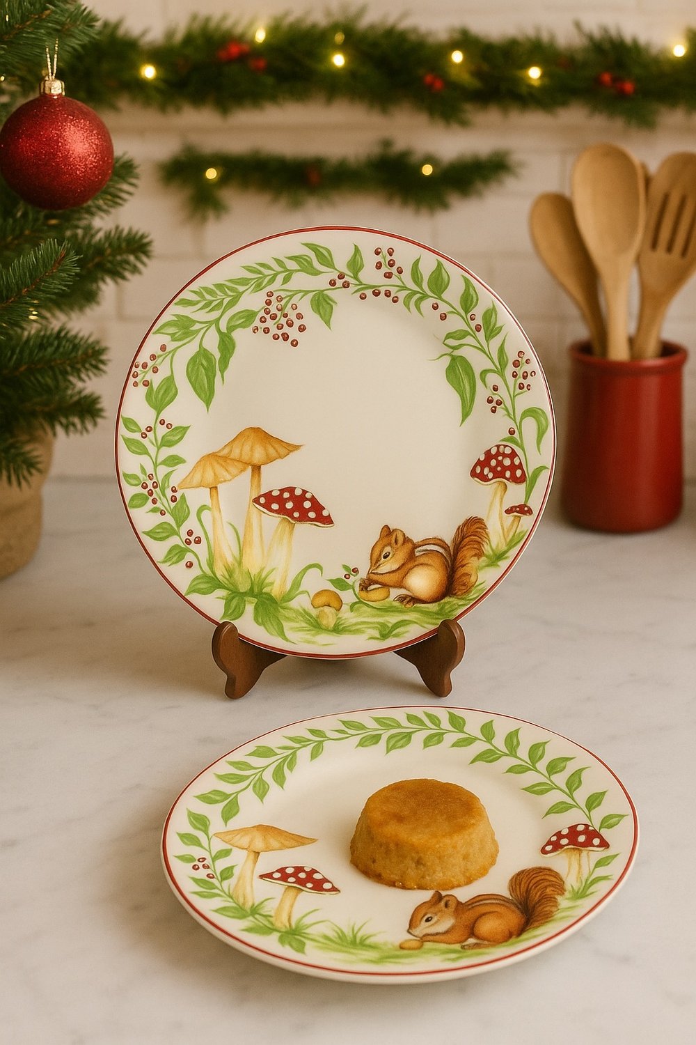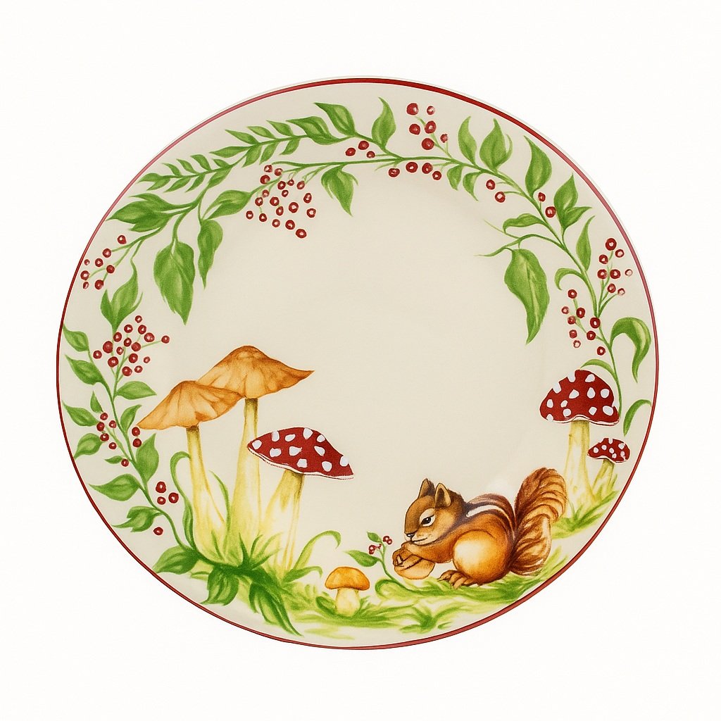 Coleção: Esquilo na Floresta Material: Cerâmica / Pintura Manual Acabamento: Alto Relevo Cores: Branco, Vermelho e Verde Composição: 06 Pratos de Sobremesa Circunferência: 20 cm Altura: 3 cm