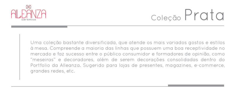 Alleanza Cerâmica, com sede na cidade de Porto Ferreira é uma empresa focada na fabricação de louças voltada para a mesa posta. A empresa nasceu com intuito de oferecer ao mercado nacional e internacional produtos diferenciados. Após pesquisa de campo na Europa, resolvemos trazer para o Brasil a mais alta tecnologia em equipamentos. Inspirados por essas valiosas ideias, desenvolvemos o projeto e hoje a Alleanza se destaca na produção cerâmica.