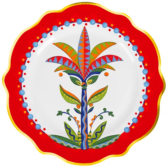 Este prato para sobremesa se destaca pelo design artesanal vibrante, com uma ilustração central inspirada na natureza e em elementos tropicais. As cores vivas, os detalhes geométricos e a borda ondulada em vermelho criam uma peça alegre e cheia de personalidade, perfeita para compor mesas criativas e cheias de charme.