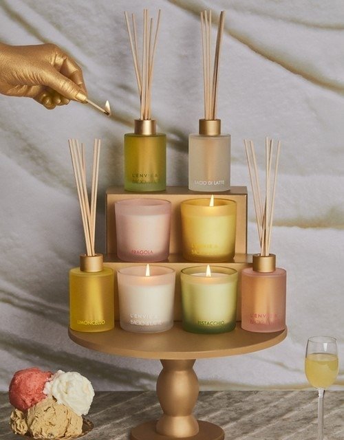 A decoração em tons neutros e arquitetura rústica já faziam parte da assinatura visual das gelaterias e agora os apreciadores dela podem levar consigo mais um pouco desta experiência sensorial, cremosa e refrescante através de velas e difusores.