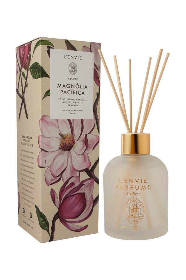 O difusor de perfume Magnólia Pacífica 200ml é indicado para a perfumação de todos os ambientes, seja em casa ou no escritório. Com uma nova identidade visual a linha Arabesc traduz suas fragrâncias por meio de aquarelas desenhadas nas embalagens. As ilustrações foram feitas por Bella Mary O’Mahony, ilustradora apaixonada pela natureza e residente na Nova Zelândia.