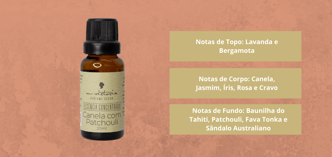 Com um perfume marcante e envolvente, a fragrância Canela com Patchouli possui atributos de um aroma oriental amadeirado. Sua nota de fundo em Lavanda e Bergamota, nota de corpo em Canela, Jasmim, Íris, Rosa e Cravo e nota de fundo em Baunilha do Tahiti, Patchouli, Fava Tonka e Sândalo Australiano.
