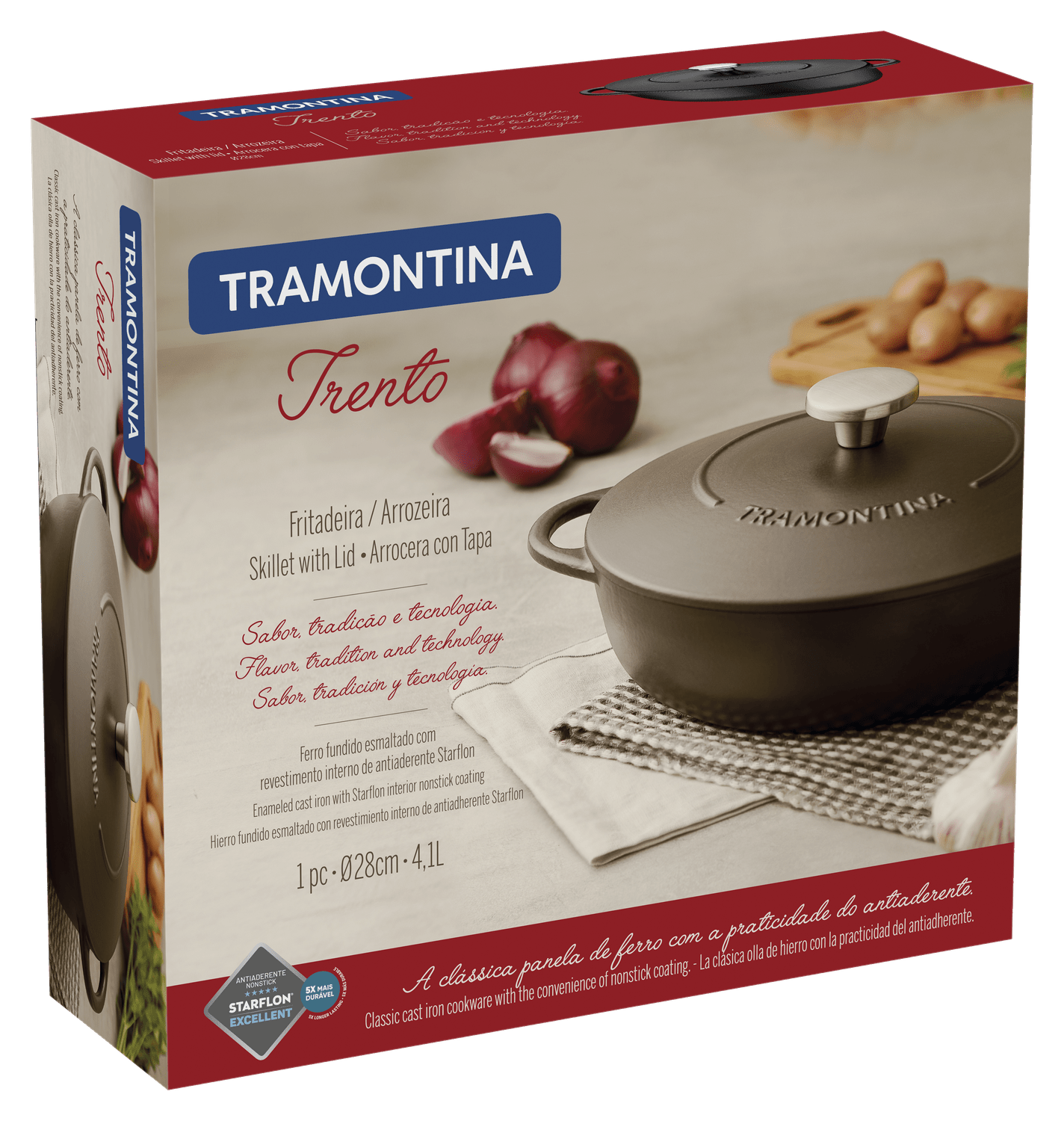 A fritadeira Tramontina Trento é sinônimo de versatilidade, pois pode ser utilizada para preparar os mais variados tipos de pratos, podendo ser levada tanto ao forno quanto ao fogão. Seu material em ferro esmaltado proporciona um cozimento uniforme do alimento, e seu revestimento interno antiaderente Starflon Excellent garante que o alimento não grude em sua superfície, tornando mais prático o preparo da refeição e a limpeza após o uso.
