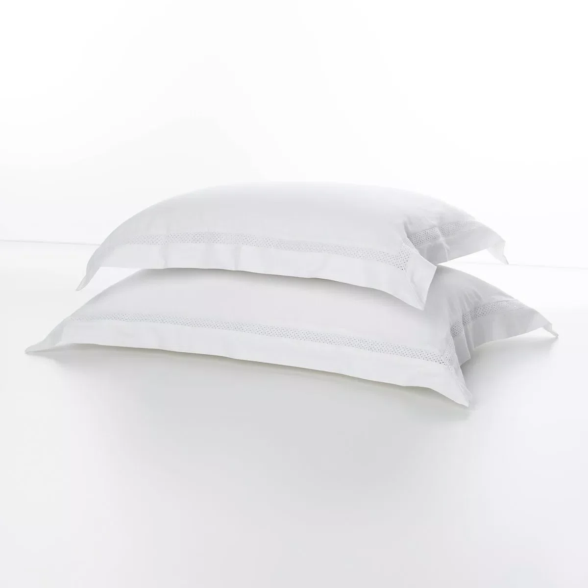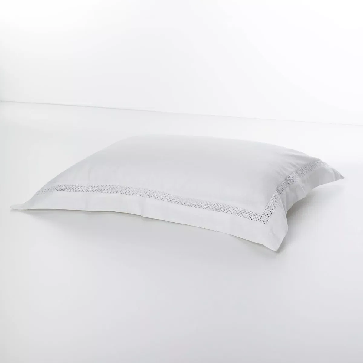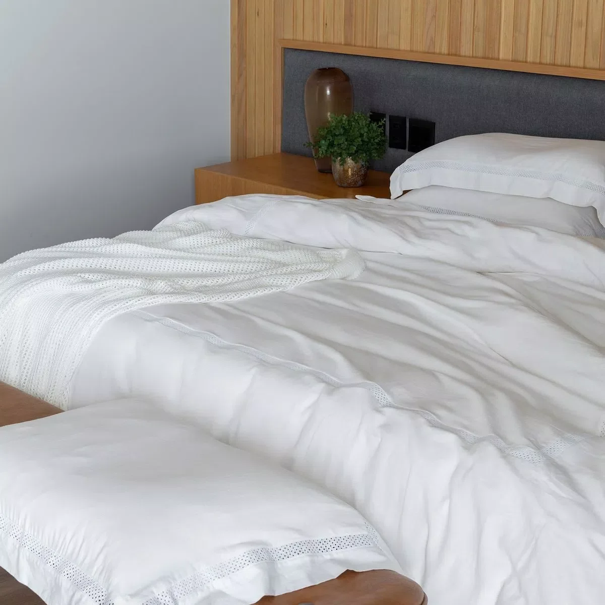 Cama SQUARE traduzida nas linhas retas bordadas no entremeio que emoldura as peças em puro linho. É o equilíbrio em sua decoração e deixam o ambiente moderno e requintado.