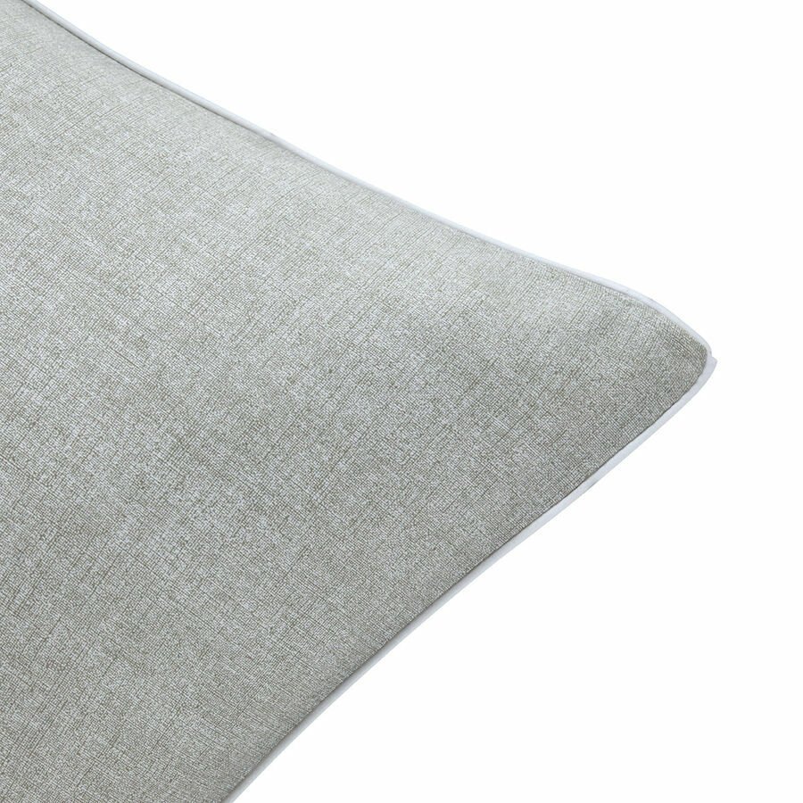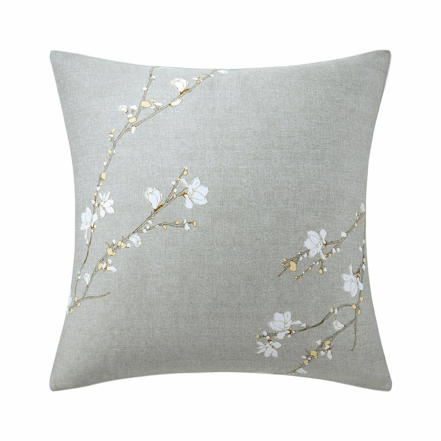Longos ramos em flor de primavera desenhados com agulhas. Os botões e pétalas são iluminados por uma tonalidade leitosa, com um fundo cinza texturizado. Um debrum óptico branco ilumina o contorno das fronhas. Acessórios em cores branco ou amêndoa misturam-se suavemente nessa cama contemporânea e feminina.