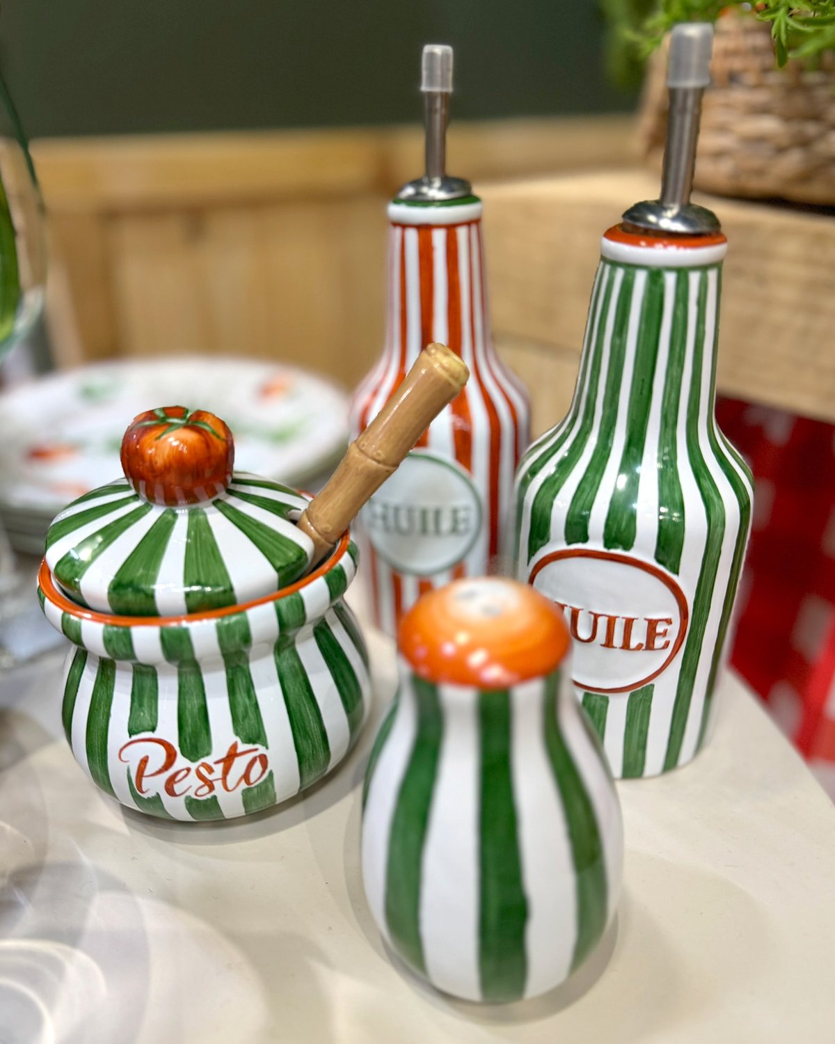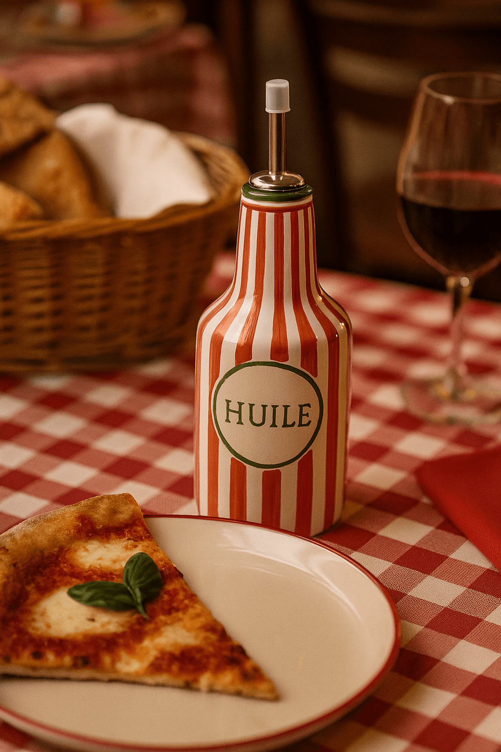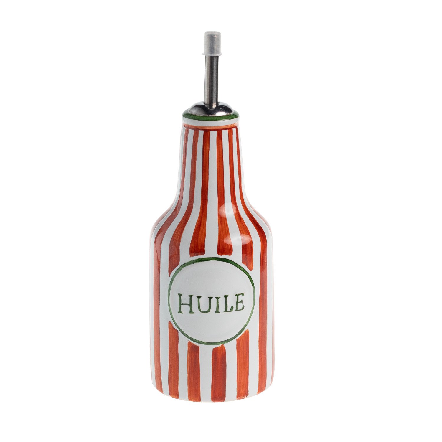 Garrafa com dosador recomendada para azeite ou vinagre. Produzido em cerâmica artesanal com pintura manual na cor vermelho com detalhes em verde, possui escrita em alto relevo.