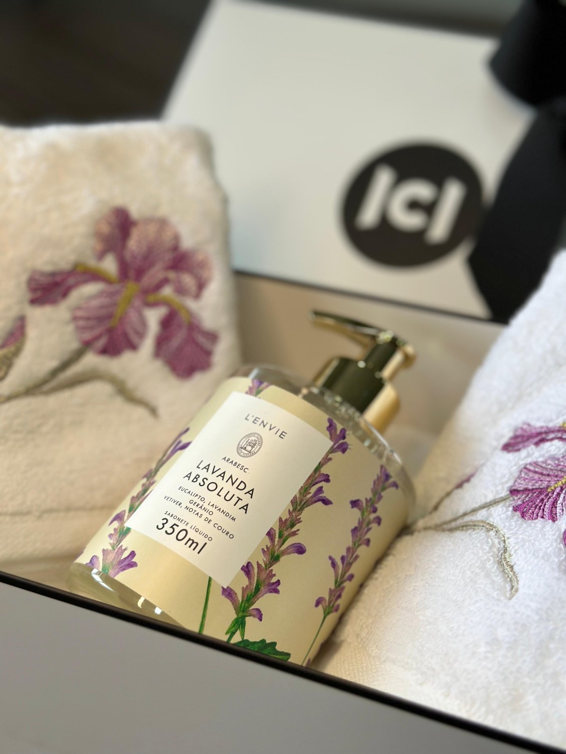 Ideal para presentear, esse gift set conta com um jogo de toalhas de lavabo Trussardi Bordadas e um sabonete líquido da fragrância Lavanda Absoluta L'envie, em uma linda caixa presenteável.