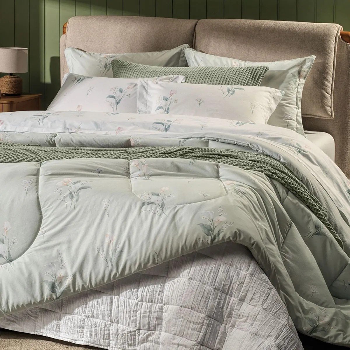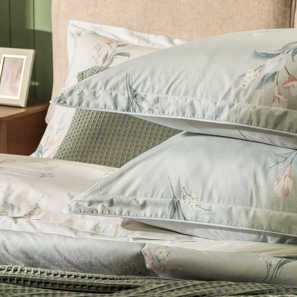 O kit de fronhas Lydia traduz a leveza do floral com um toque de refinamento. Com estampa de arranjos de flores delicados, as duas peças são finalizadas com cordonê nas três abas, realçando os contornos com elegância sutil e complementando a cama Lydia ou mesmo camas lisas em tons claros e verdes. Confeccionadas em algodão 200 fios com fio penteado, unem toque suave, caimento impecável e charme romântico. Perfeitas para compor a cama com frescor e harmonia.