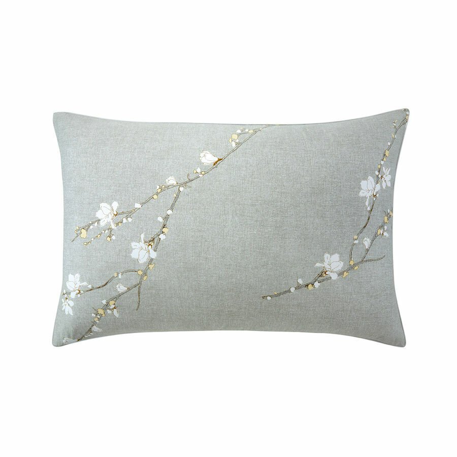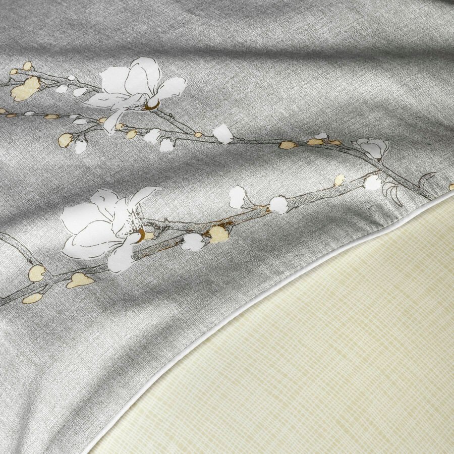 Longos ramos em flor de primavera desenhados com agulhas. Os botões e pétalas são iluminados por uma tonalidade leitosa, com um fundo cinza texturizado. Um debrum óptico branco ilumina o contorno das fronhas. Acessórios em cores branco ou amêndoa misturam-se suavemente nessa cama contemporânea e feminina.
