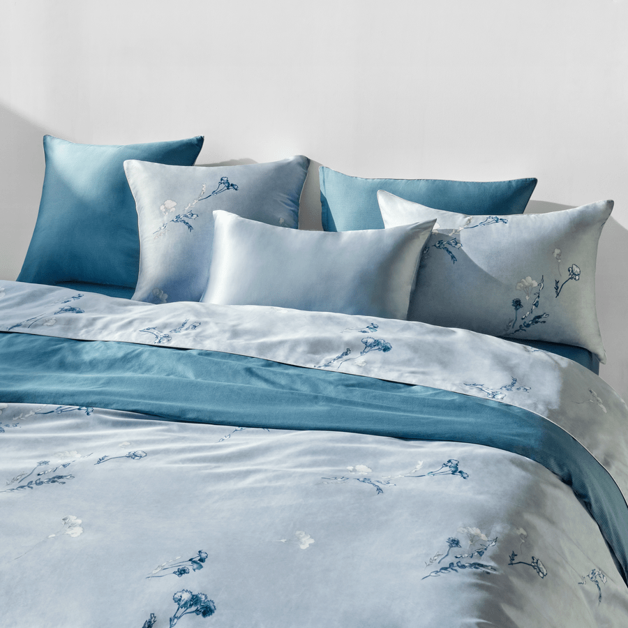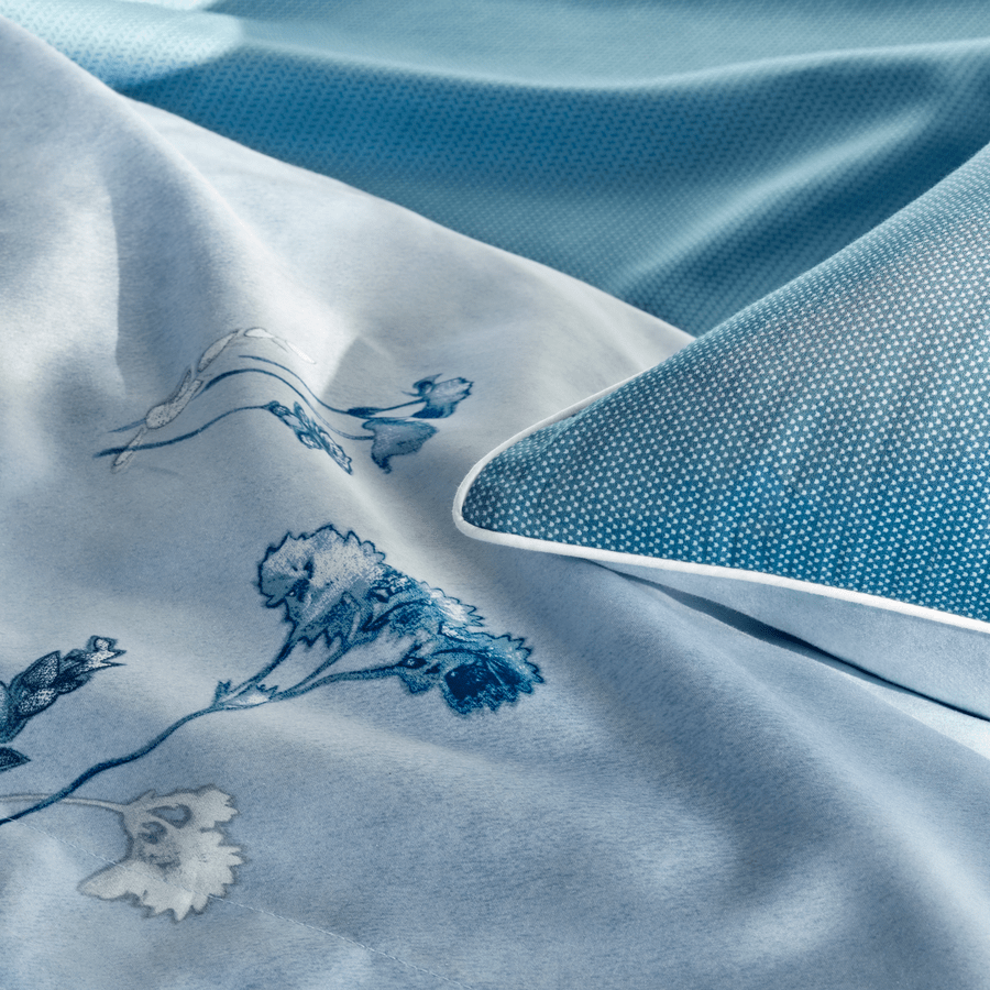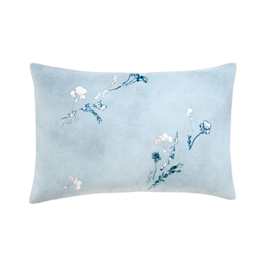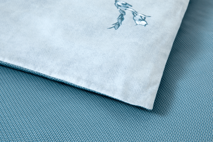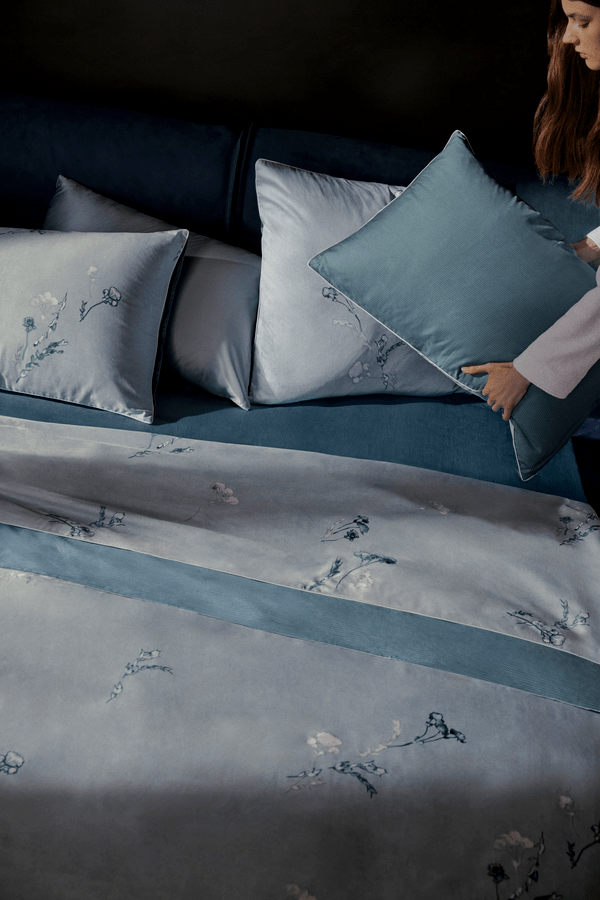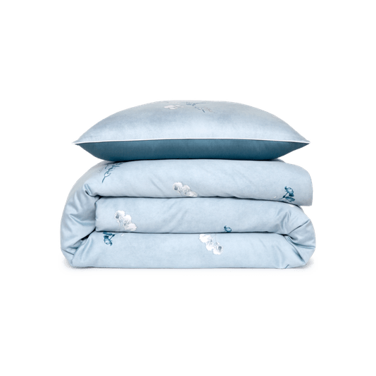 Contra um fundo de céu azul acinzentado, tons de névoa, gramíneas e flores silvestres aparecem nas estampas. O cetim de algodão 300 fios é aliado a uma inspiração natural e suave. No verso, um padrão estampado evoca uma sementeira de finos grãos, em tom tempestuoso. As fronhas são finamente debruadas em branco.